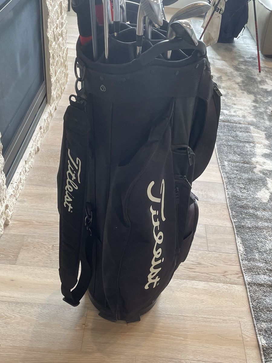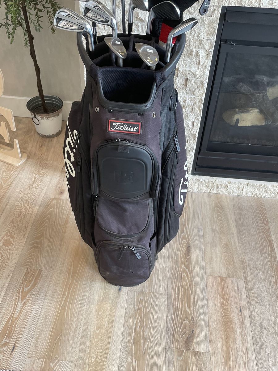 VenmoNo clubs included. This listing is for bag only. Nice black titleist golf cart bag. This has individual slots for each club to keep them protected. In good condition. Does have some scuffs on the front from a fall off cart on pavement. Lots of life left in this bag. These are $250 brand new. Cover is also with the bag.