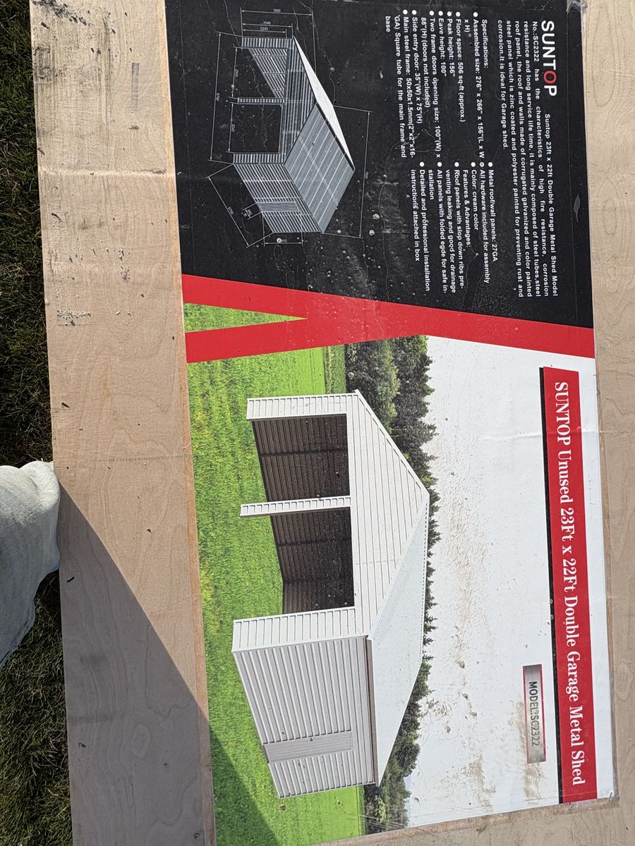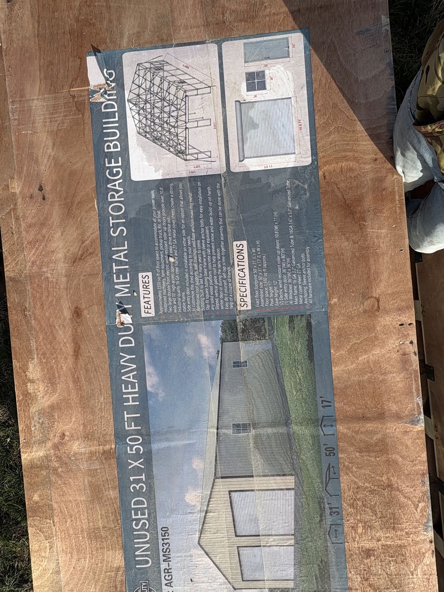 Venmo1500 sq ft pre fab building. Includes everything to build the building. Will include eletric roll up doors, man door and 4 windows. Cream colored building. Building is 31 ft wide, 50 ft deep, and 17ft tall. It is 3 crates for the build and 1 for the roll up doors. I can possibly load depending on notice. You will need a flat deck trailer to move it. It’s around 6000 lbs.