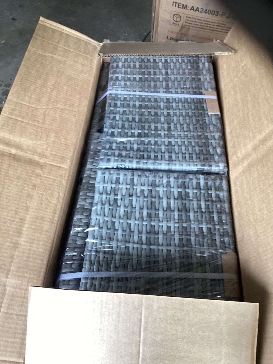 Opened box just enough to verify contents, and it appears to be a gray woven wicker/rattan-style outdoor furniture set with matching gray finish. Great for a patio, porch, balcony, or small backyard seating area.