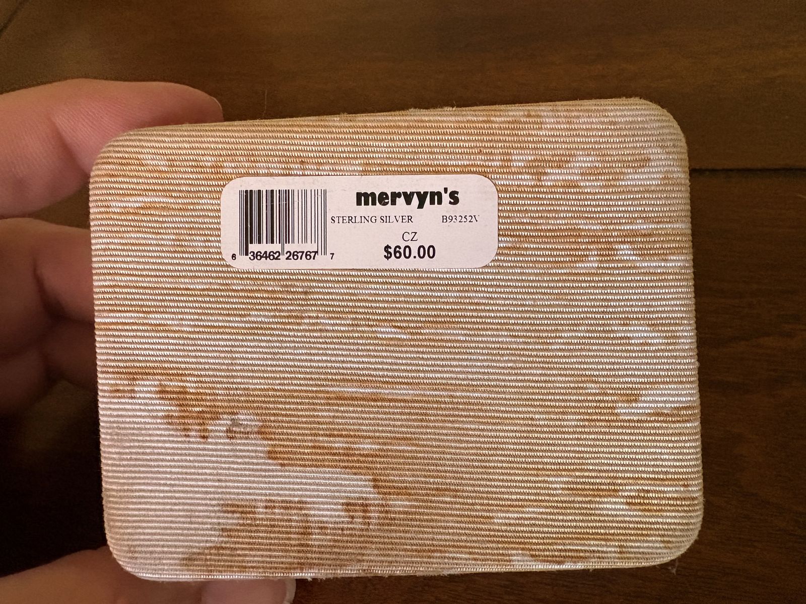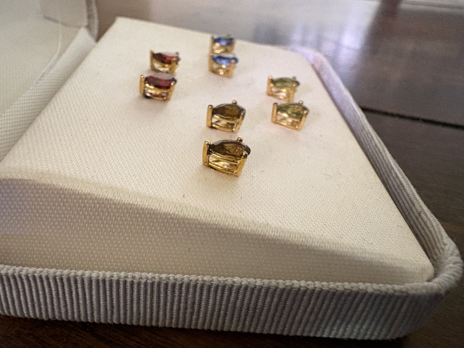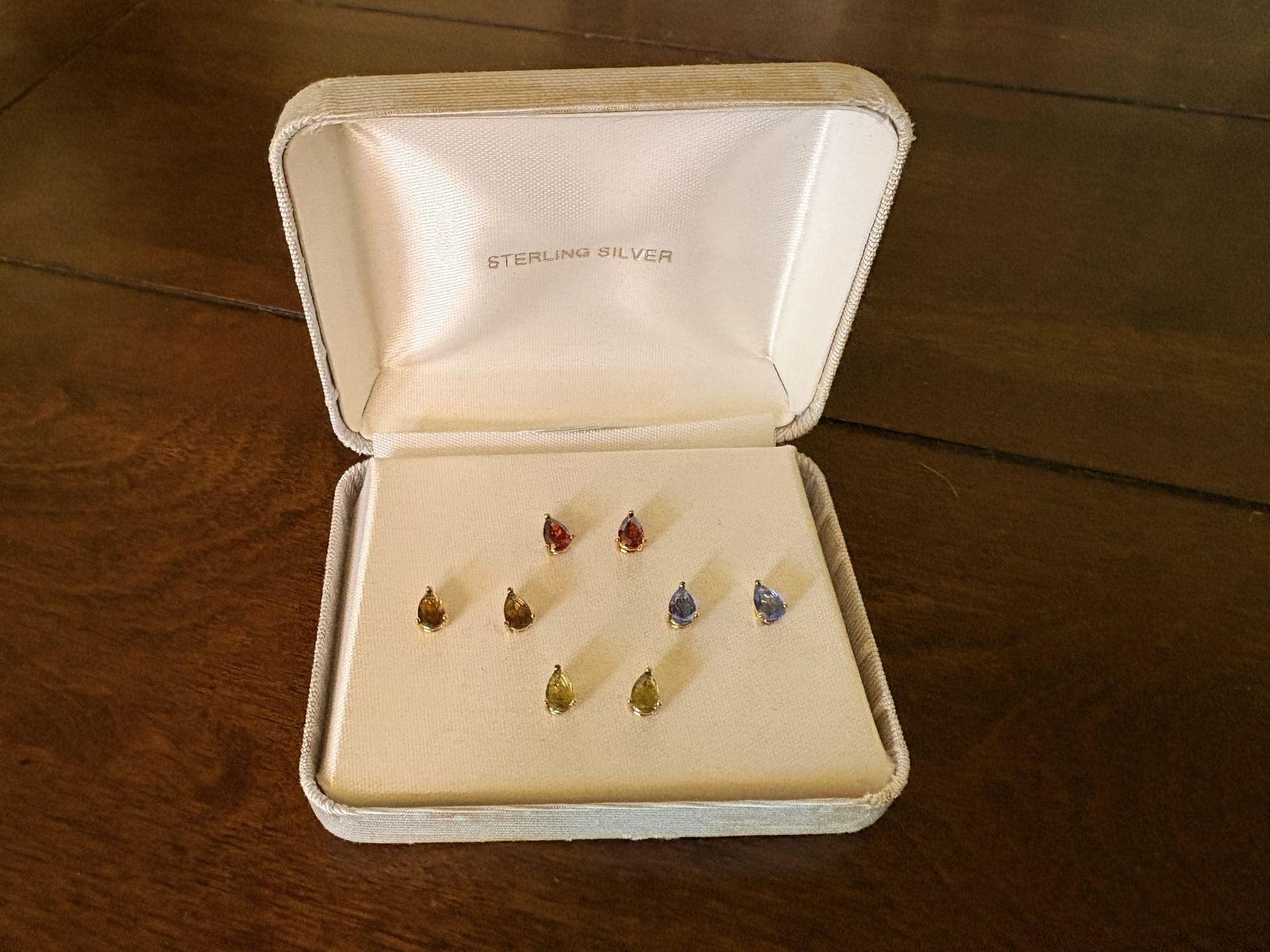 I have 4 pairs of vintage sterling silver teardrop shaped stud earrings. They are gold tone but marked 925. They are still in the original case. It is discolored but has the price tag that shows they were purchased at Mervyn’s for $60 at the time. It also says Sterling Silver CZ so I assume the stones are cubic zirconia. The stones are red, blue, amber brown and greenish yellow. See my other ads for jewelry, artwork, home decor and more.