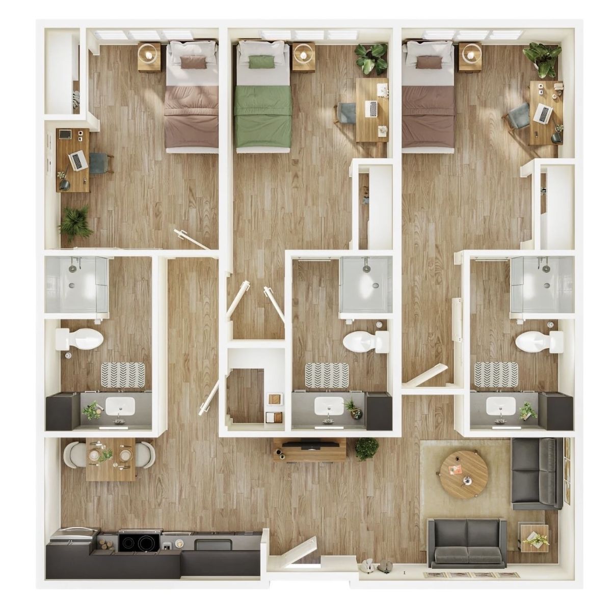 This 1042 sqft three-bed, three-bath unit is shared with two other roommates, although one is moving out so there will soon be another opening. A great option for a pair of roommates who lived in the dorms during the school year and are looking for summer housing that is close to campus!