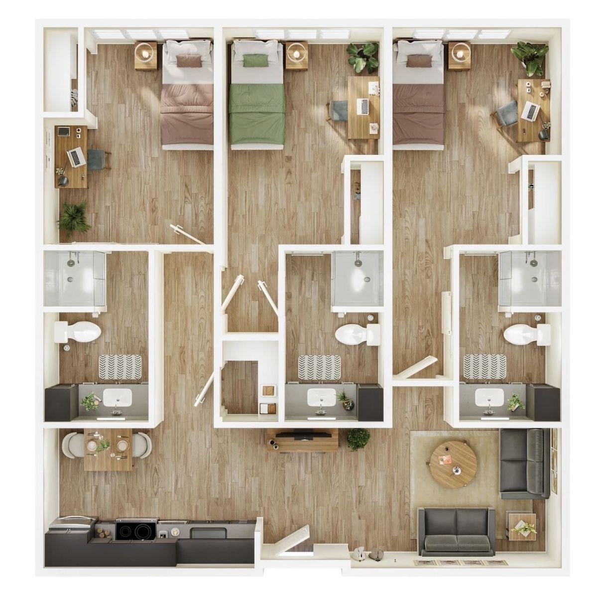 Room Description This student-only bedroom is a 250 sqft unit with a private bathroom. The bedroom includes a twin XL bed, two dressers, and a desk with a leather chair. The shared kitchen/living space includes a full size refrigerator and freezer, an oven range, a microwave, a round table with two chairs, a flat-screen television, and a large couch. There is also a spacious walk in pantry for extra food storage. This 1042 sqft three-bed, three-bath unit is shared with two other roommates, although one is moving out so there will soon be another opening. A great option for a pair of roommates who lived in the dorms during the school year and are looking for summer housing that is close to campus! Ivory University House also hosts several social events per month, providing you with lots of free food and a great chance to meet other students! As the summer approaches and the weather is getting warmer, there are usually people hanging out in the common areas outside. Play beach volleyball with your friends, lounge in the grass under the sun, or sit by the large fire pit and toast marshmallows in the cool summer evenings.