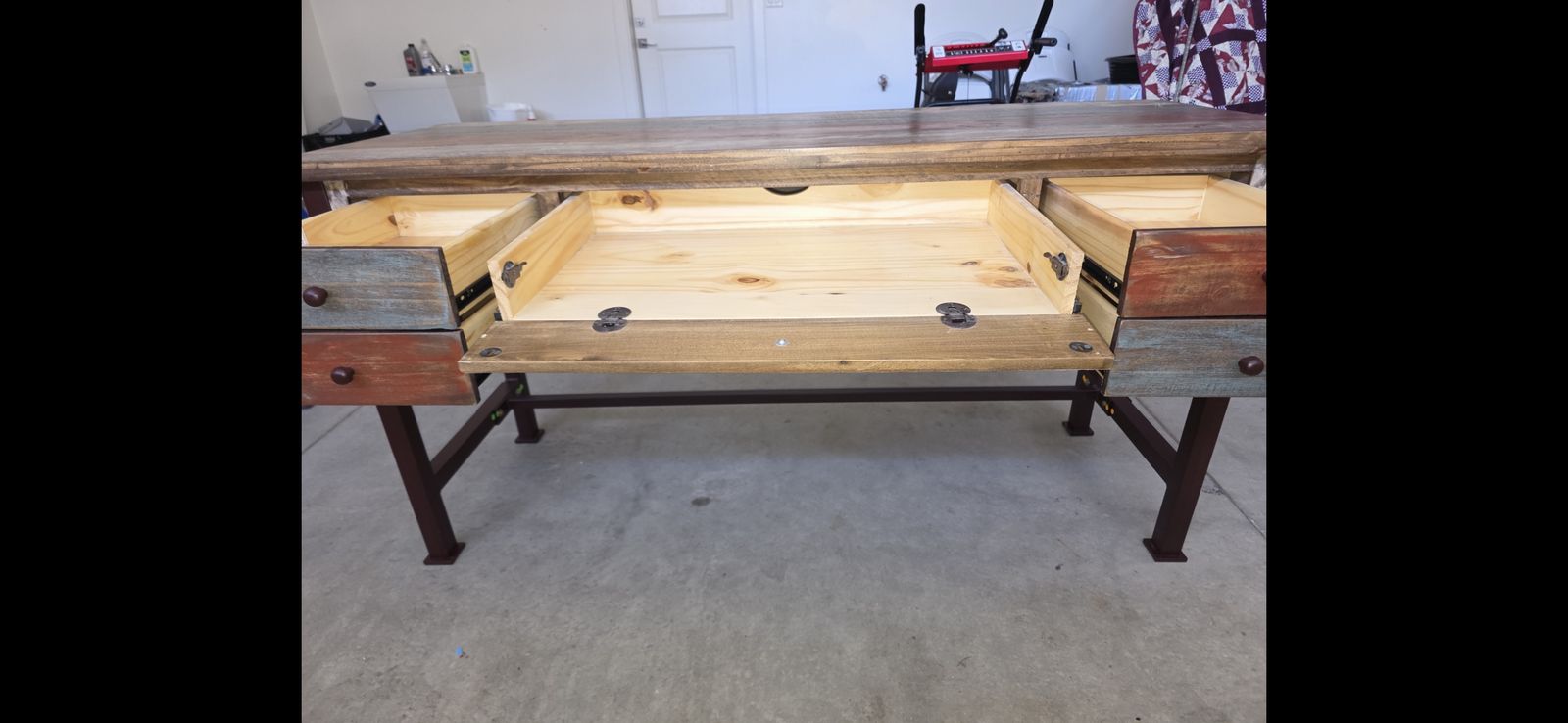 This is the exact IFD967DESK model. Solid wood, hand-wrought iron hardware. Very sturdy. The center drawer has latches and drops down to become a keyboard tray.