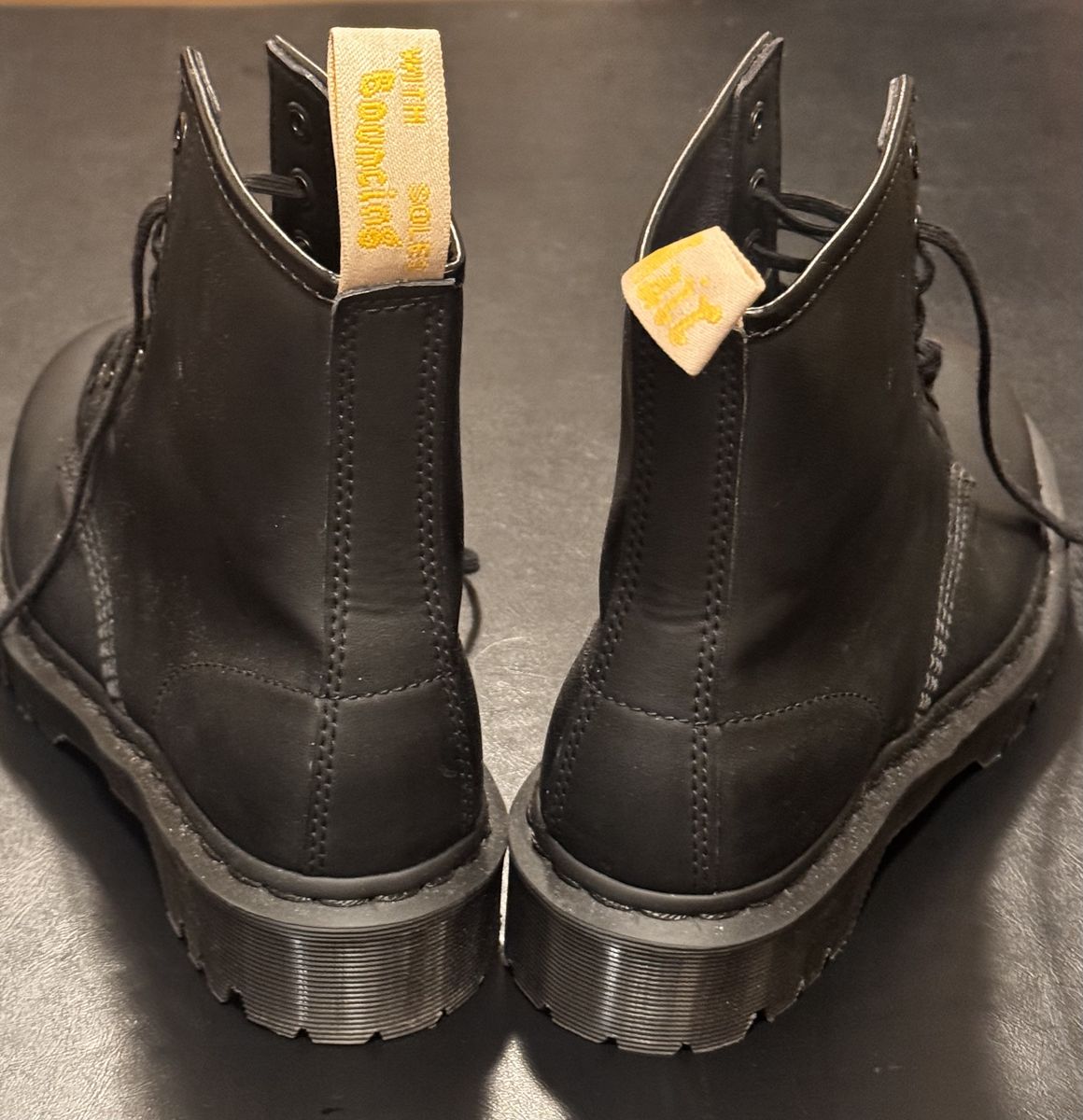 VenmoClassic black Dr Martens boots. Lace up style. Made in Banngladesh. Mens size US 8, womens size US 9. Also UK 7, EU 41. Yellow pull tabs with 'With Bouncing Soles' text.