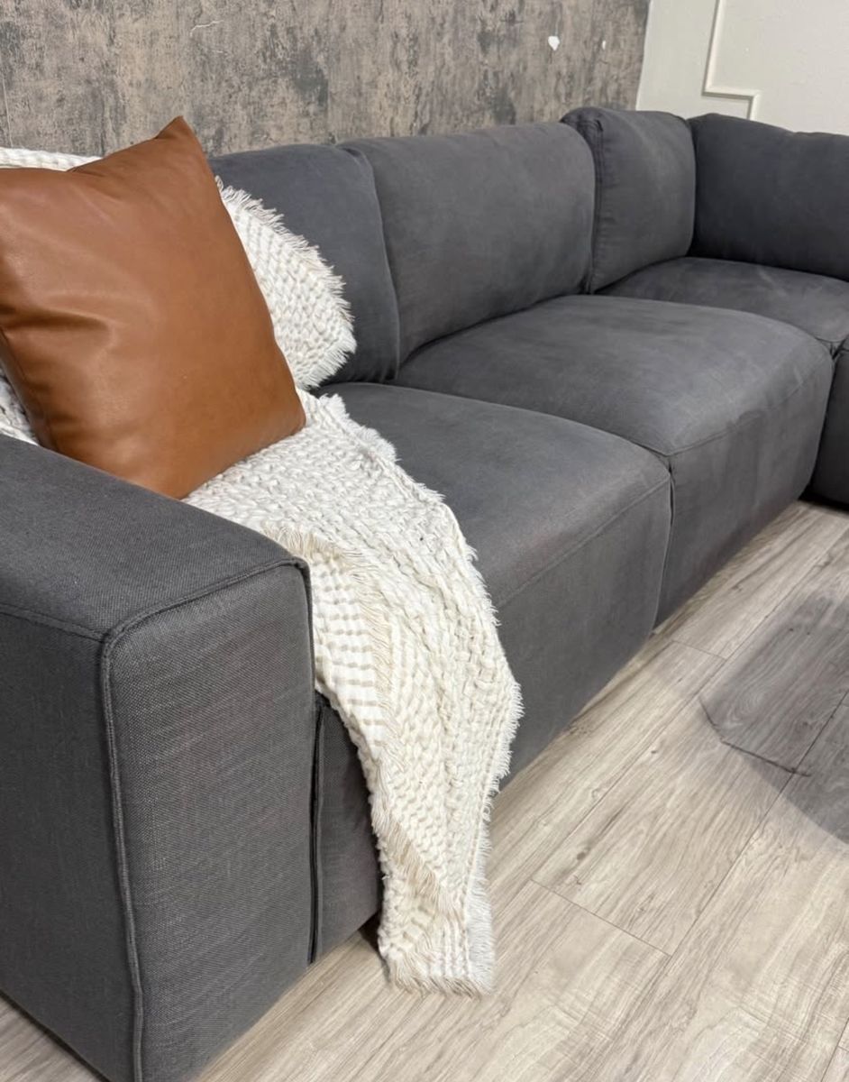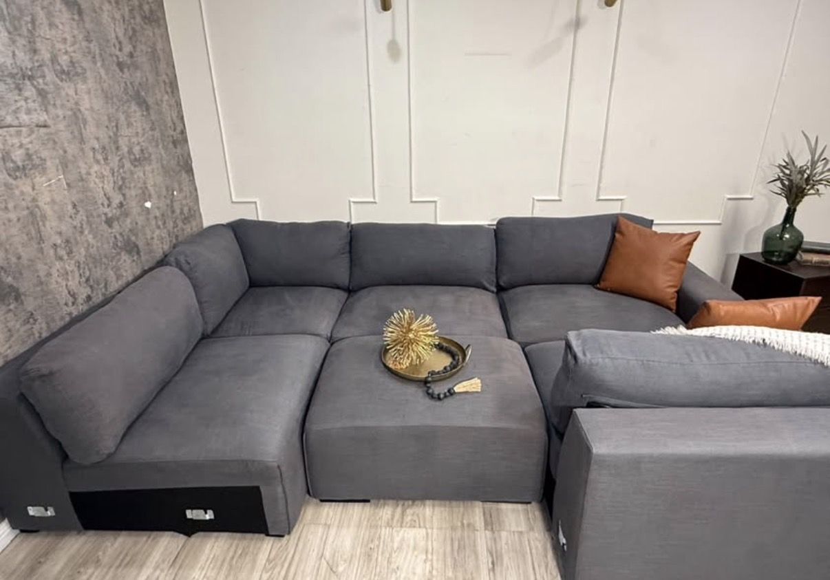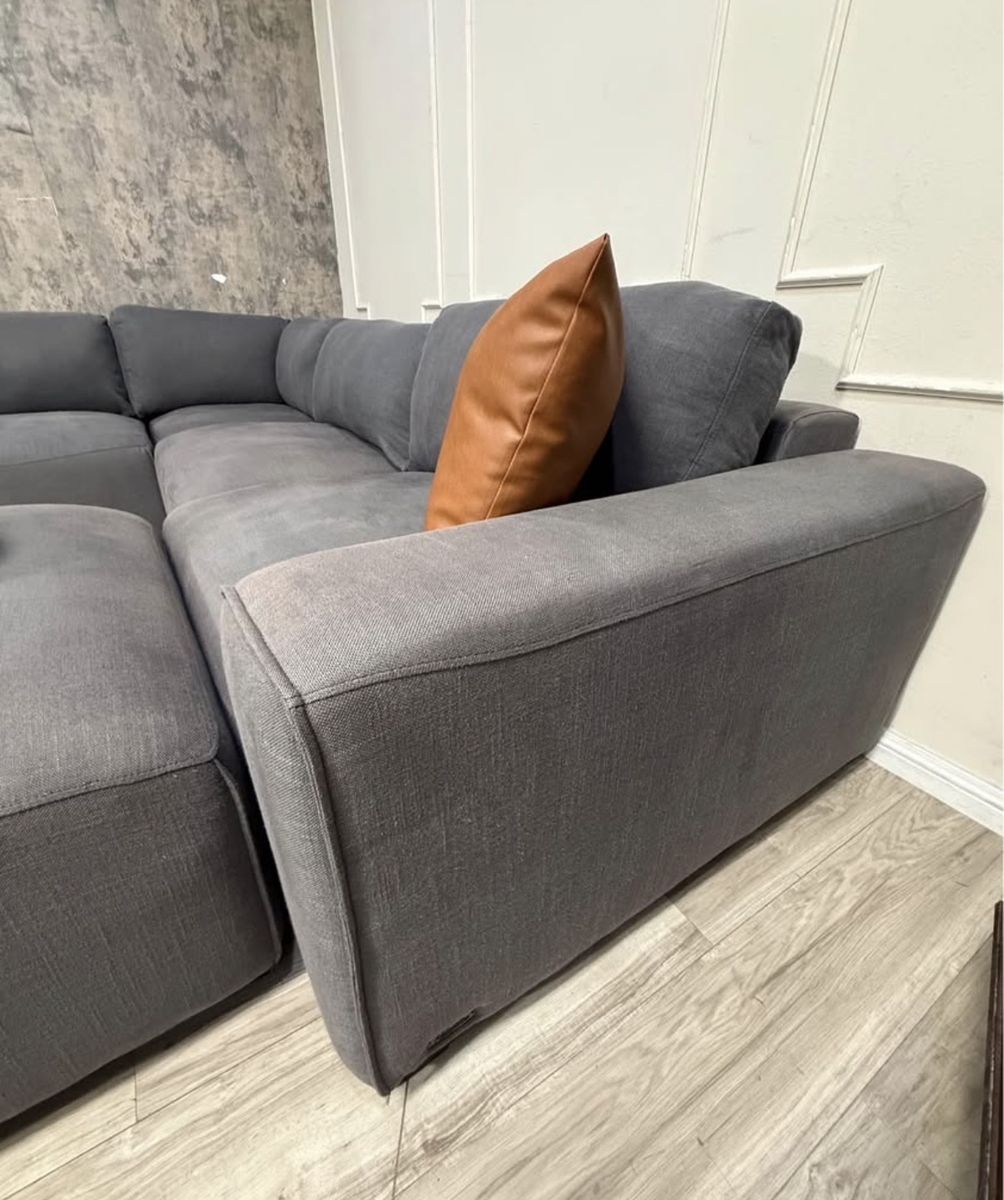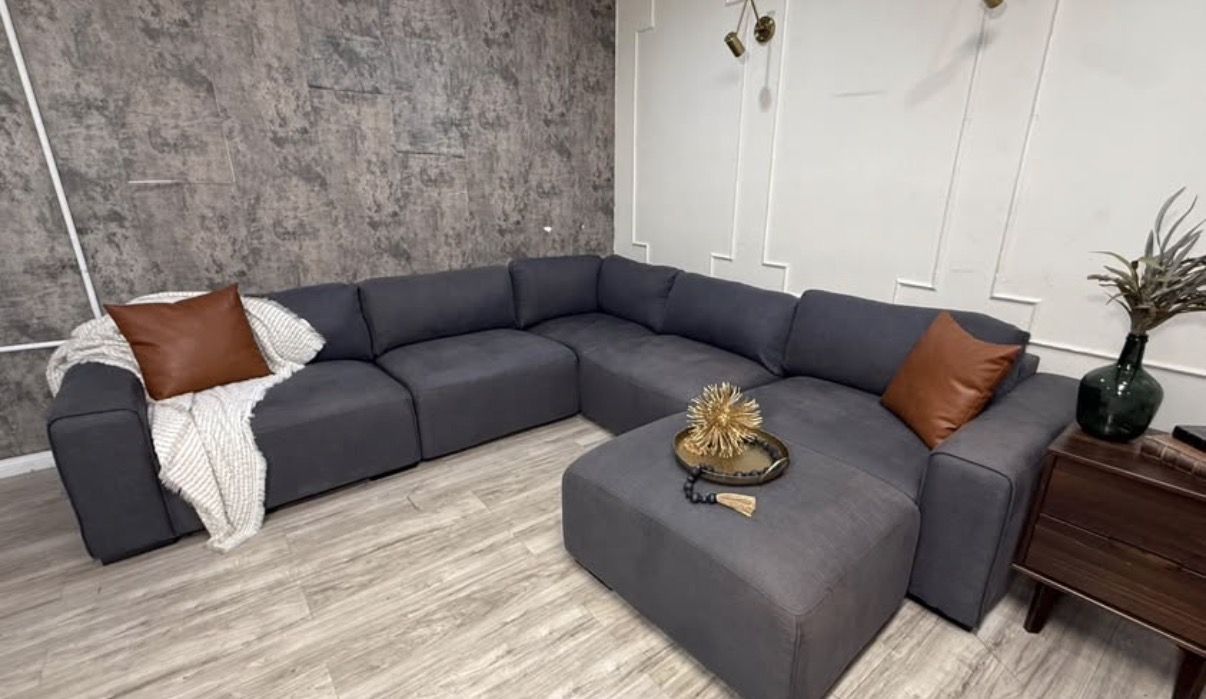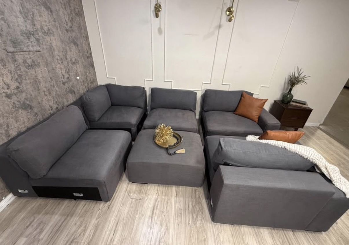 This is a fabulous ABBYSON modular sectional. Color is charcoal grey, material is fabric. Has a linen feel to it. All pieces hook together but it can be reconfigured as desired. You can even make a fun bed for movies and lounging. Back rest cushions are removable and washable.