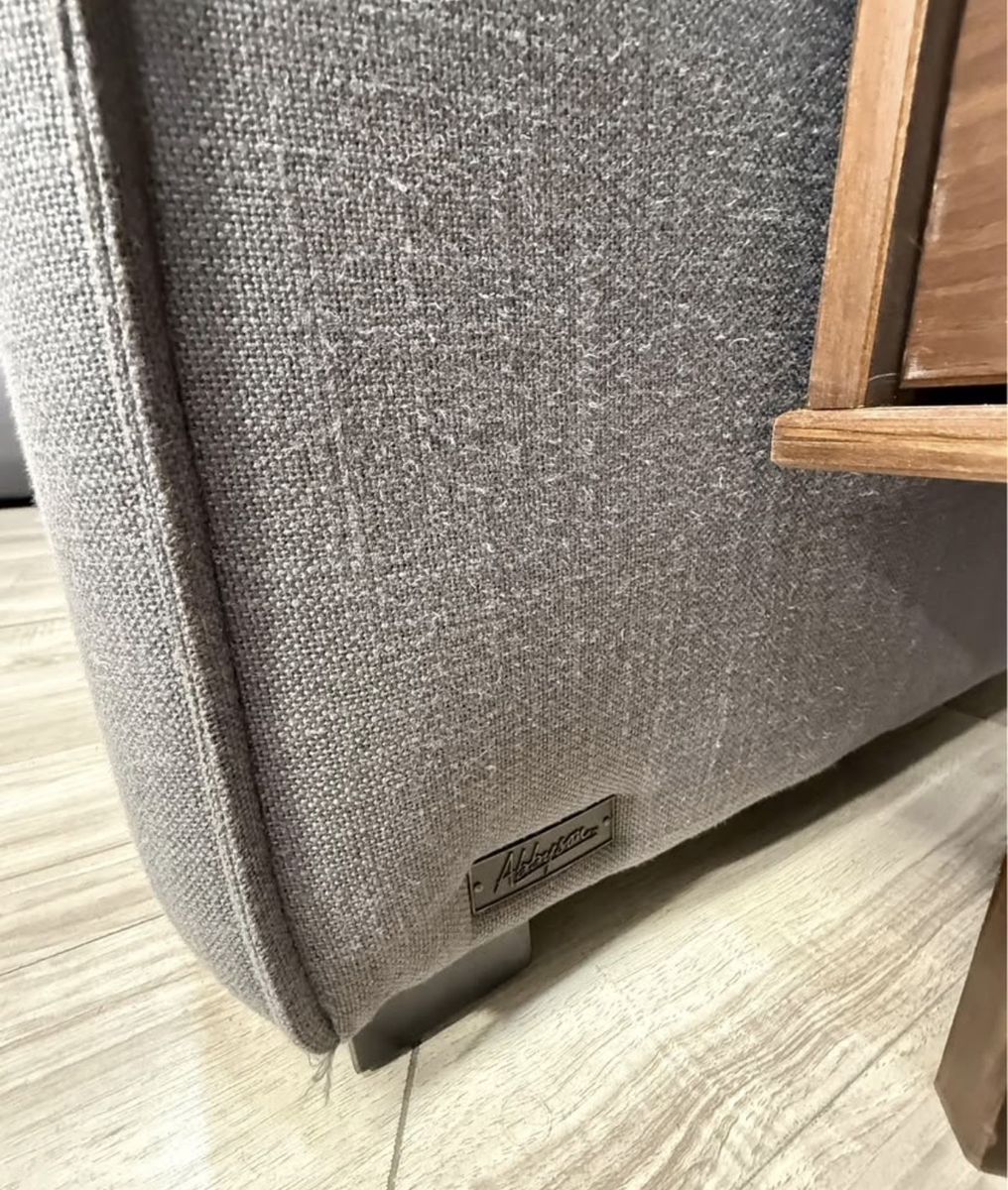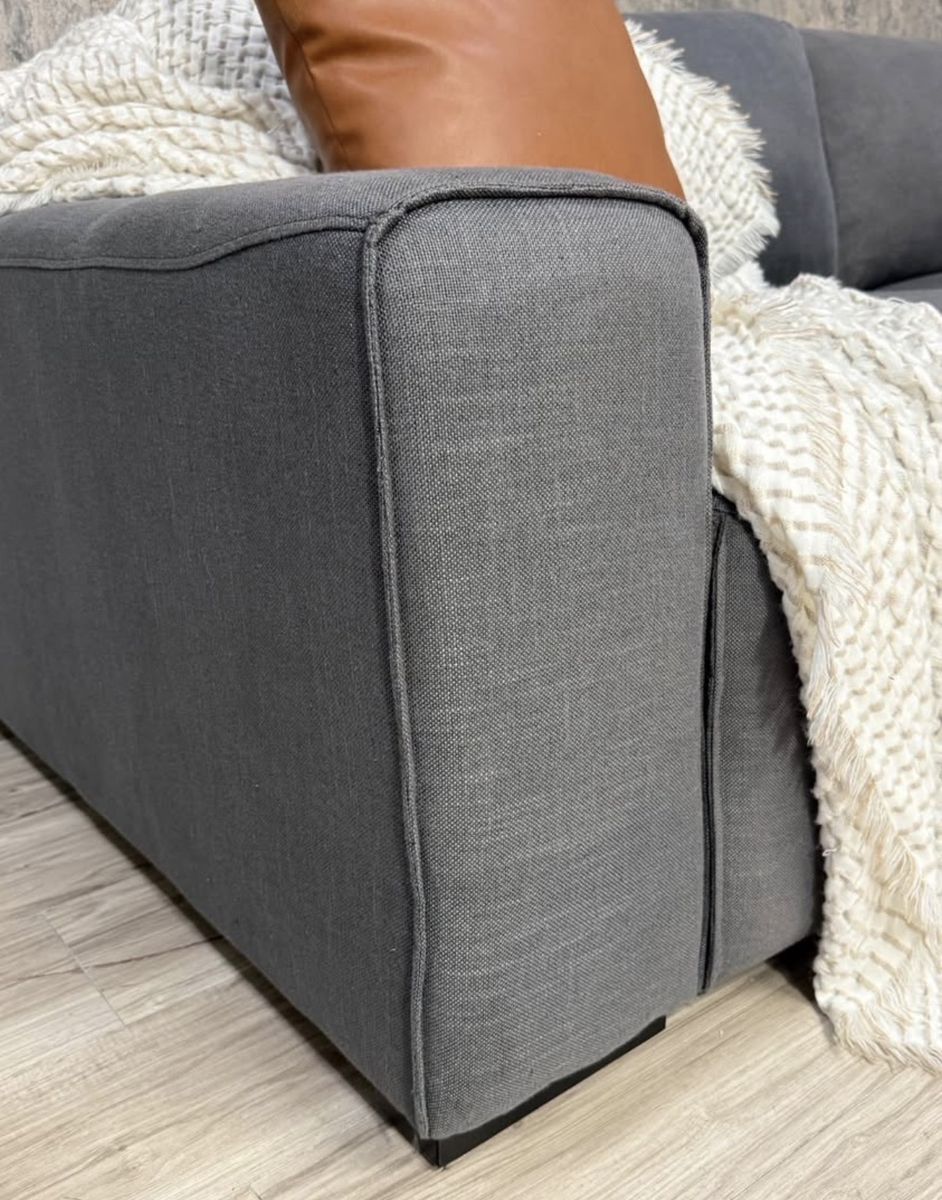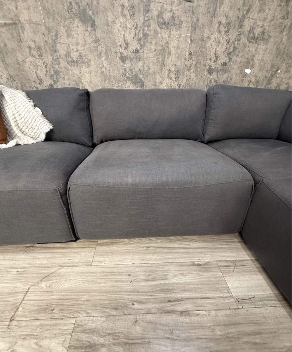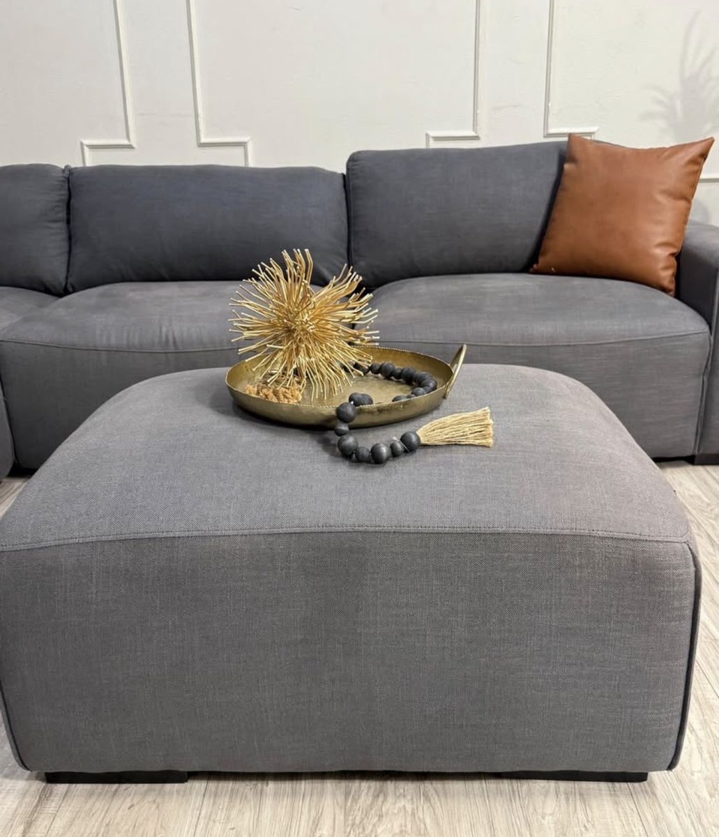 This is a fabulous ABBYSON modular sectional. Color is charcoal grey, material is fabric. Has a linen feel to it. All pieces hook together but it can be reconfigured as desired. You can even make a fun bed for movies and lounging. Back rest cushions are removable and washable.