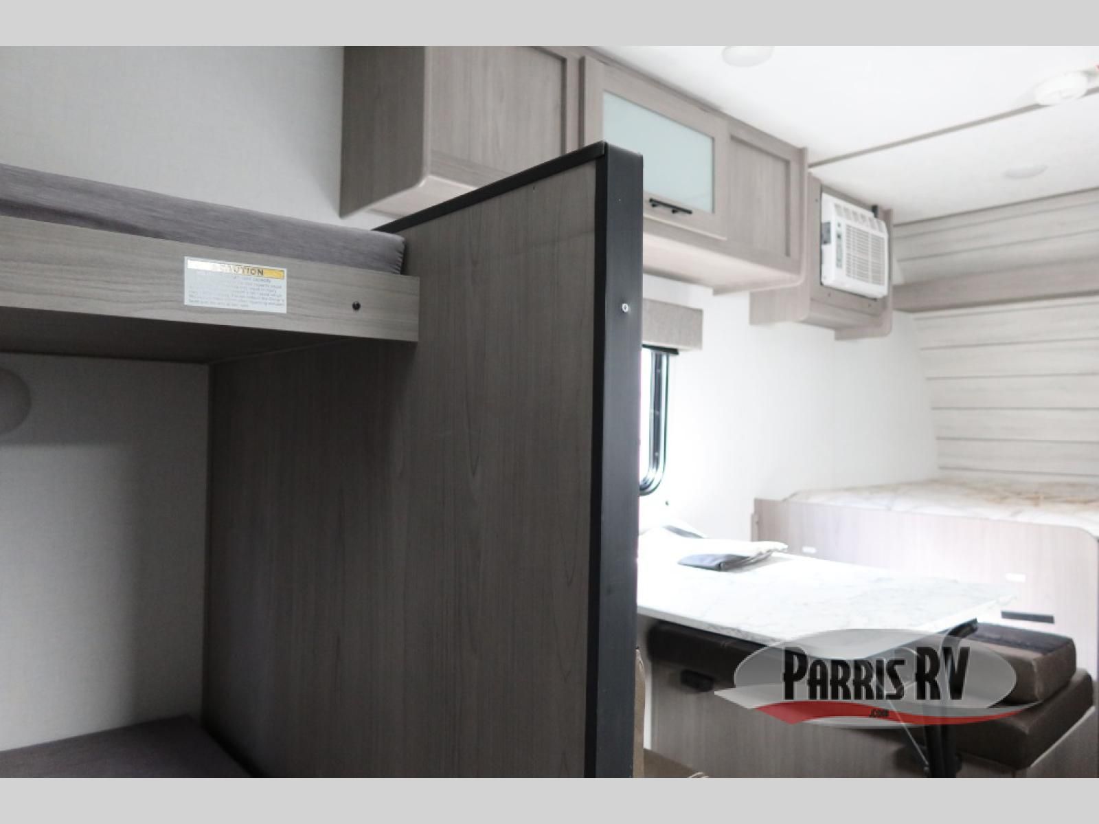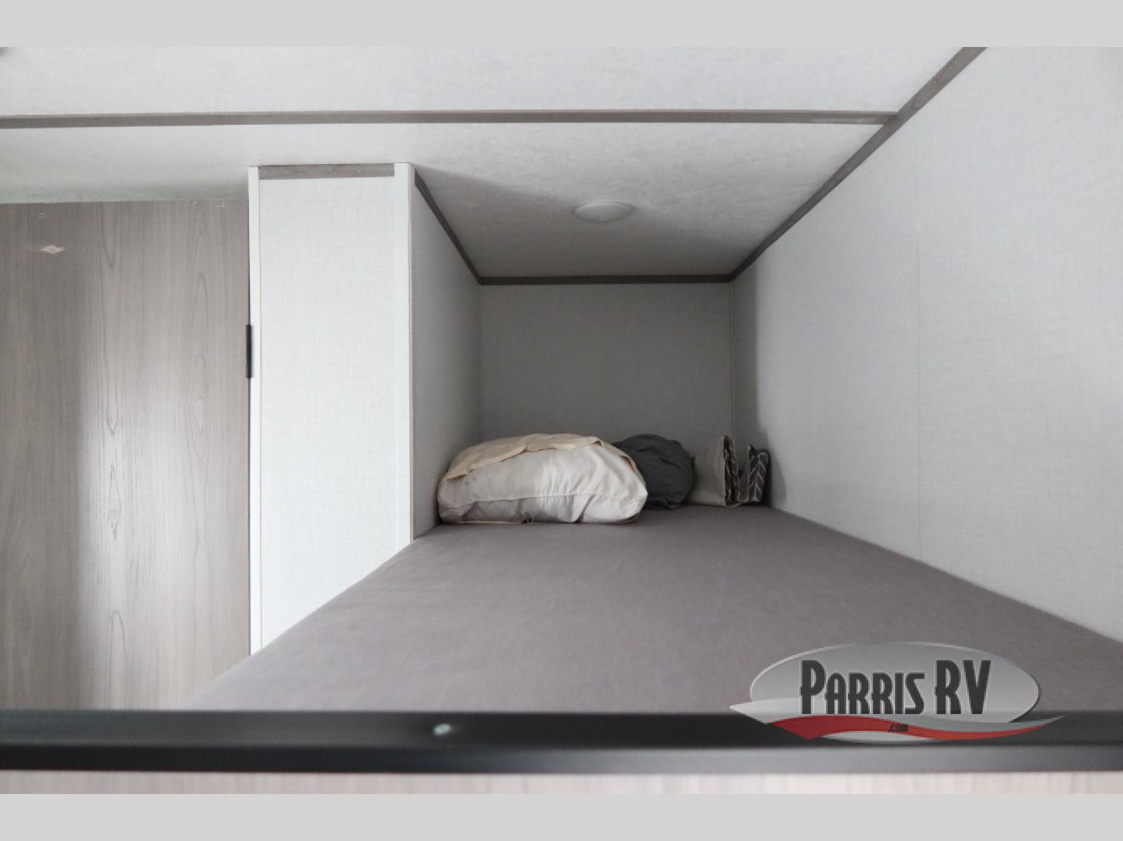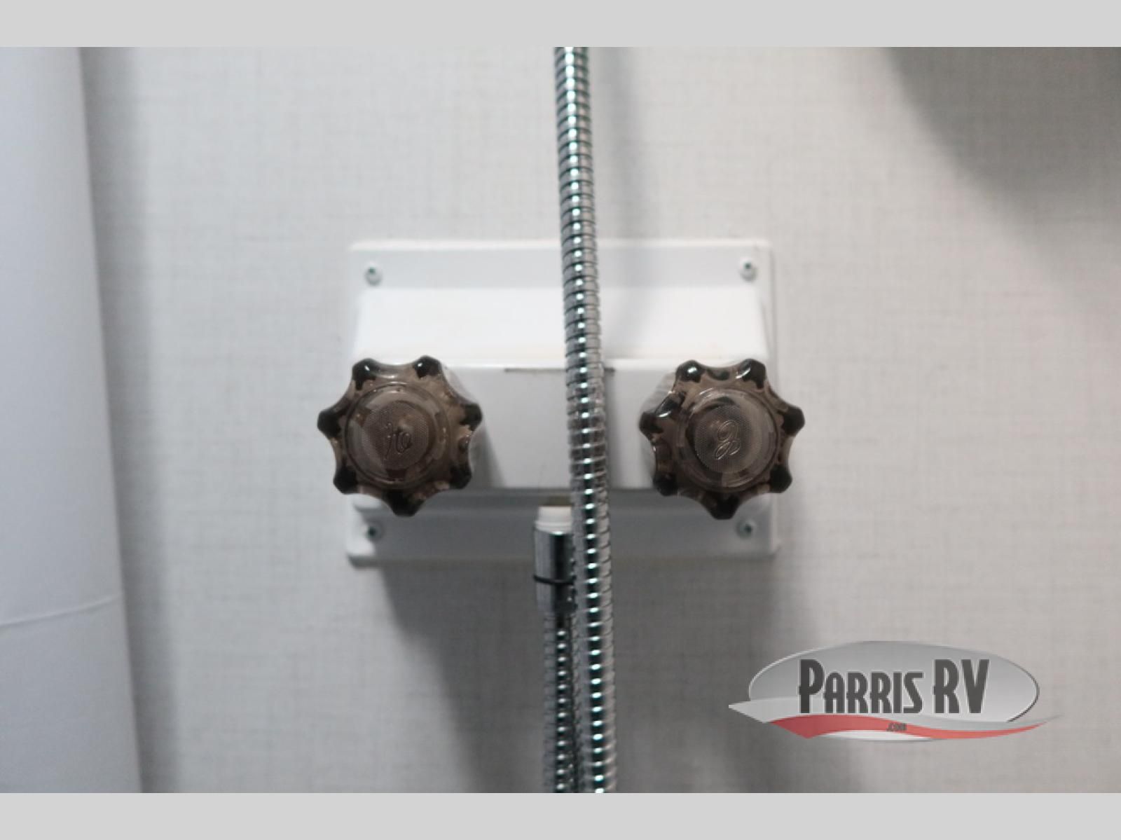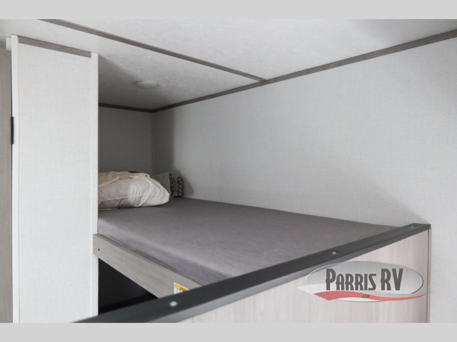 After making dinner on the two burner cooktop or inside the microwave, you can dine at the booth dinette or outside under the 8' power awning if you brought along your camping chairs. Either way you will be comfortable and the dinette may even sleep one person if needed. After playing outdoors all day, everyone can return to get cleaned up in the private bath with a shower and toilet, then fall asleep on the queen bed up front or the bunk beds in the rear corner.