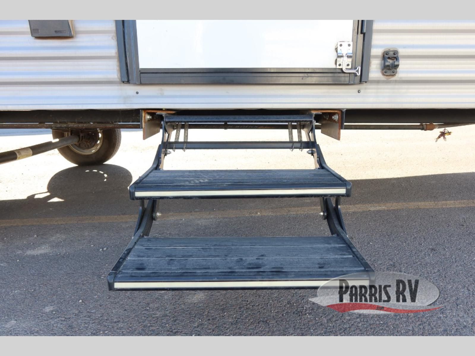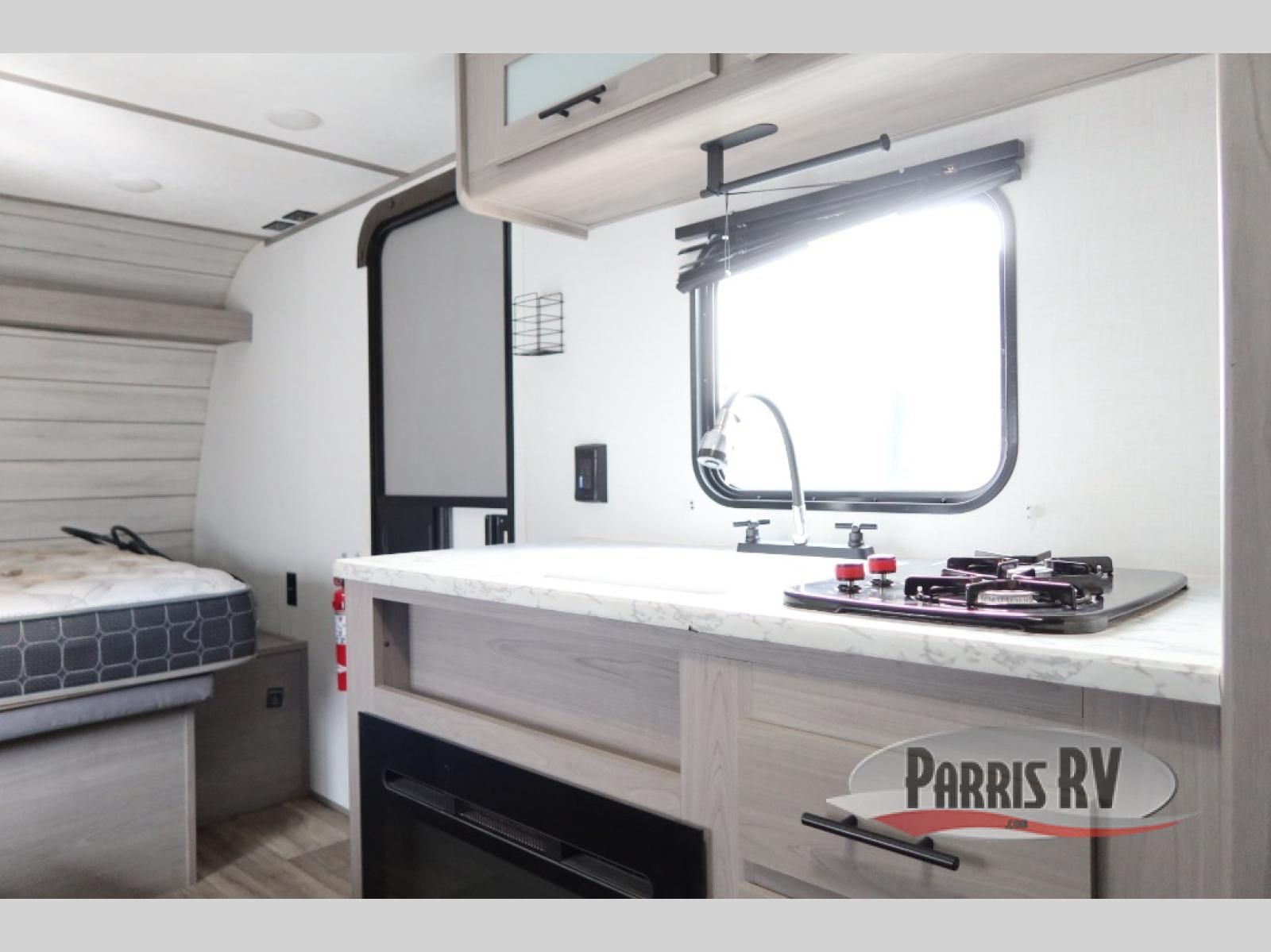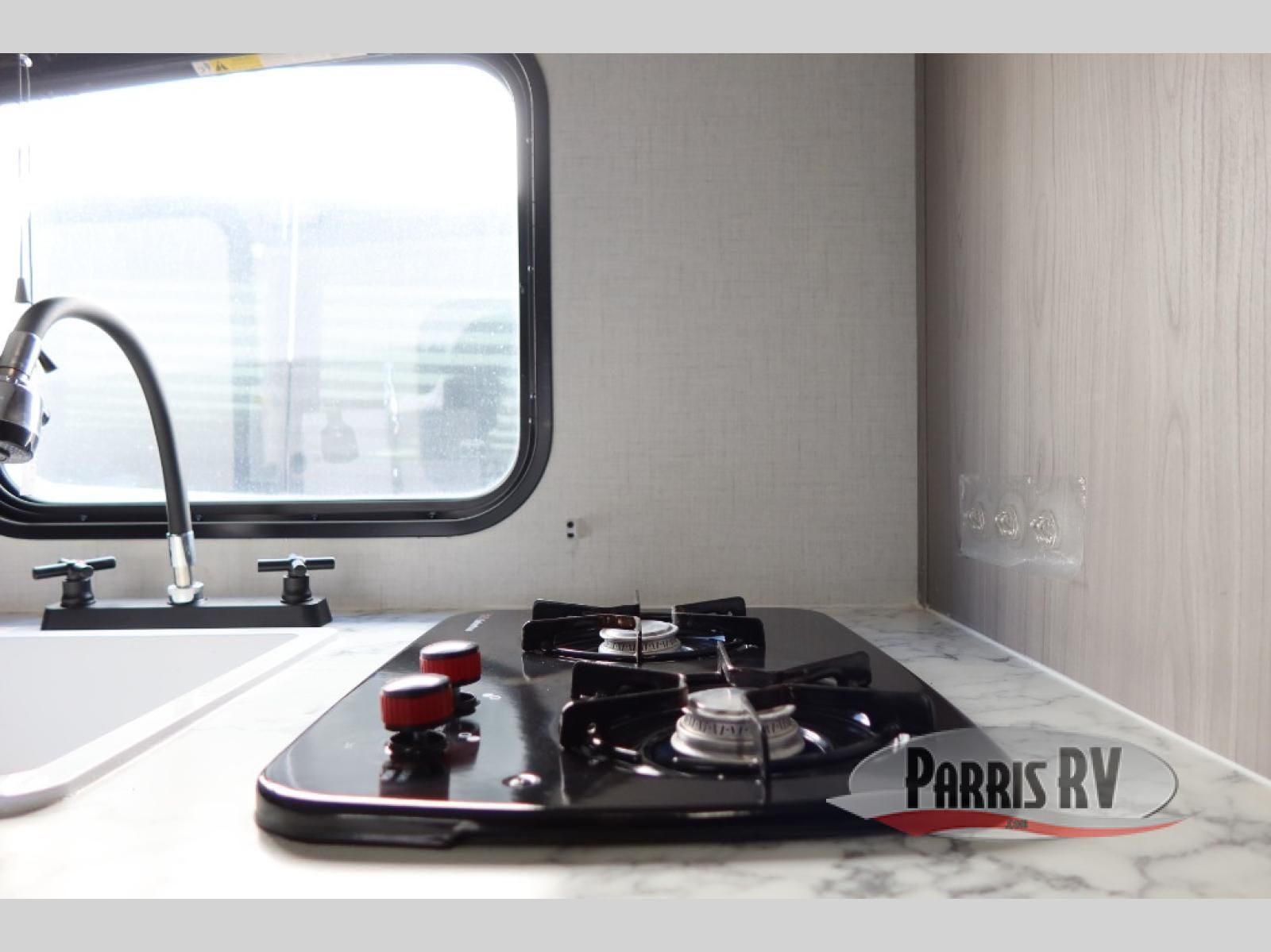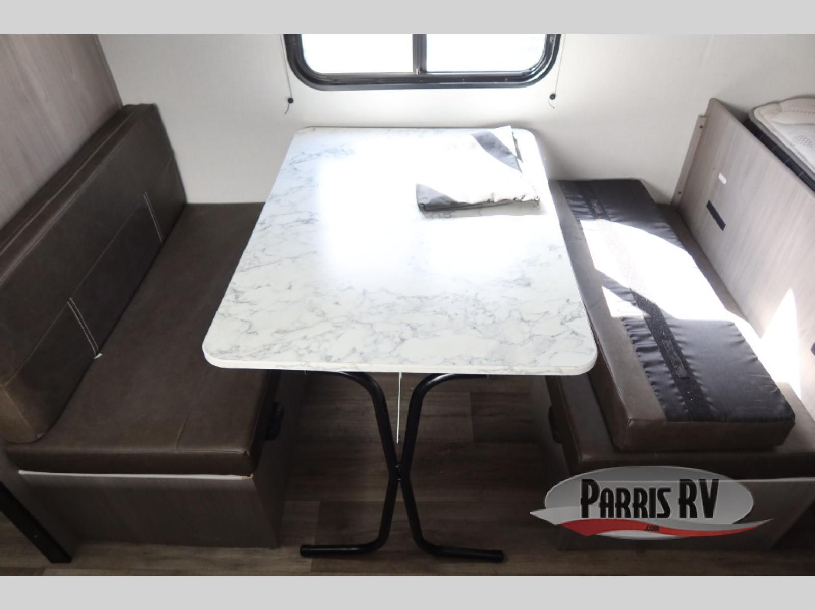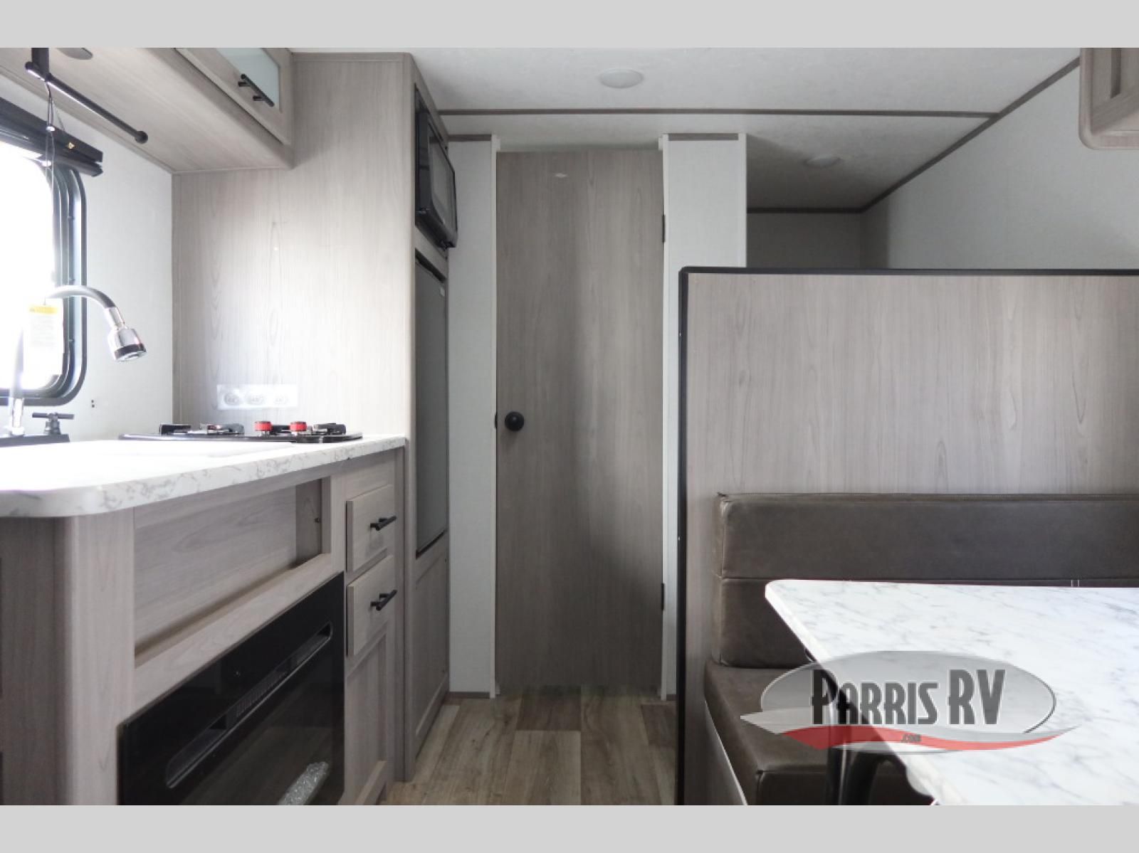 After making dinner on the two burner cooktop or inside the microwave, you can dine at the booth dinette or outside under the 8' power awning if you brought along your camping chairs. Either way you will be comfortable and the dinette may even sleep one person if needed. After playing outdoors all day, everyone can return to get cleaned up in the private bath with a shower and toilet, then fall asleep on the queen bed up front or the bunk beds in the rear corner.