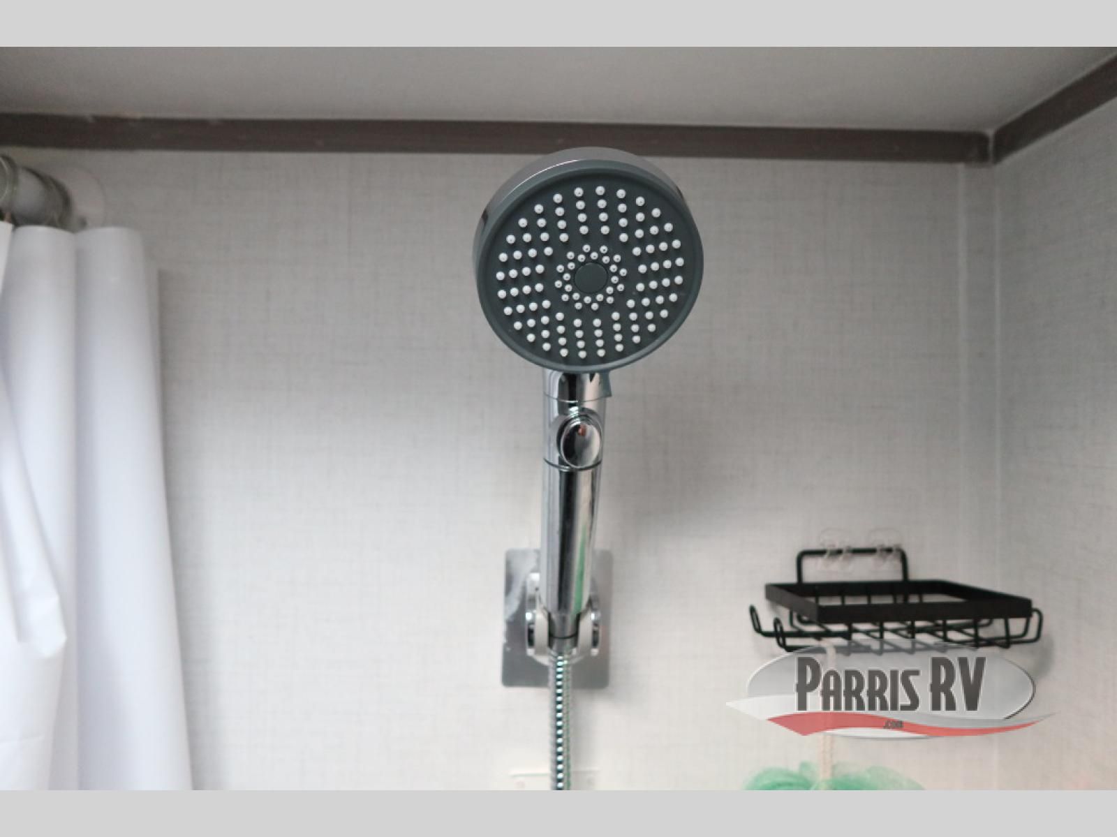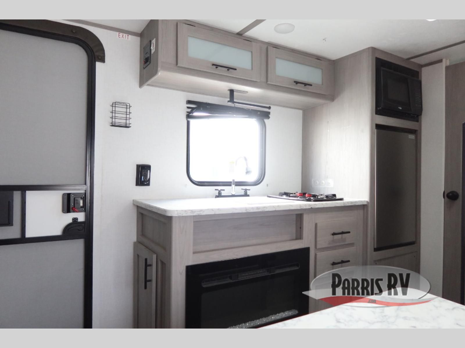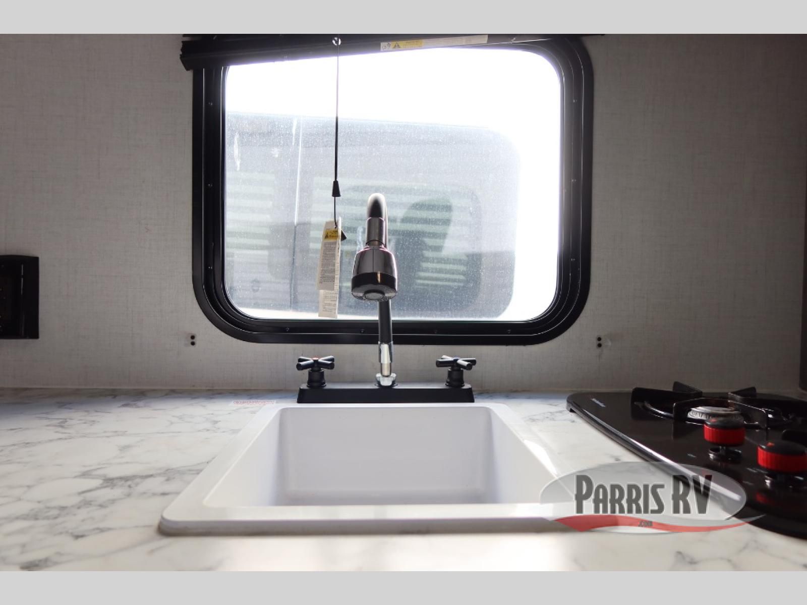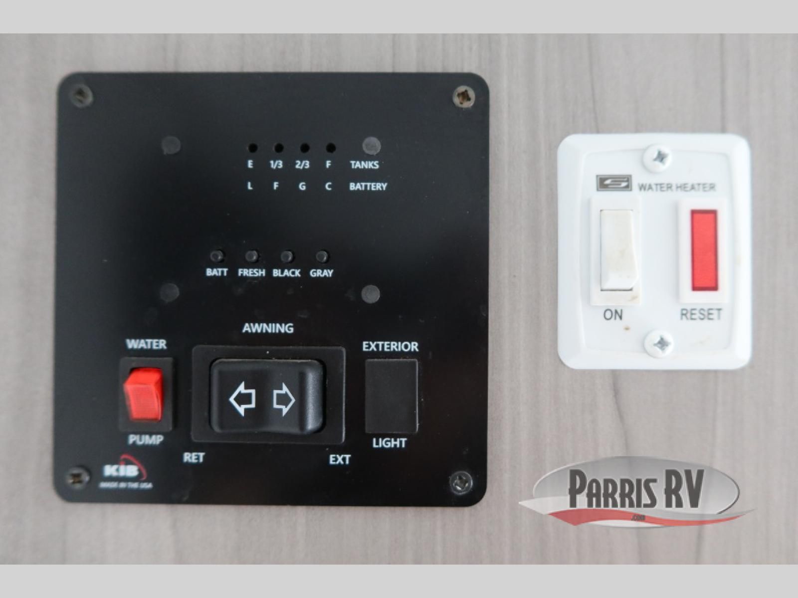After making dinner on the two burner cooktop or inside the microwave, you can dine at the booth dinette or outside under the 8' power awning if you brought along your camping chairs. Either way you will be comfortable and the dinette may even sleep one person if needed. After playing outdoors all day, everyone can return to get cleaned up in the private bath with a shower and toilet, then fall asleep on the queen bed up front or the bunk beds in the rear corner.