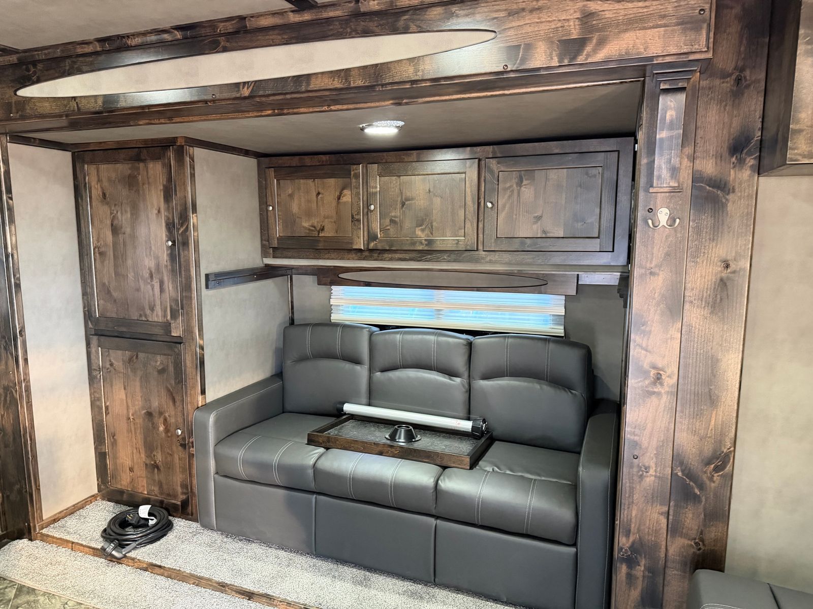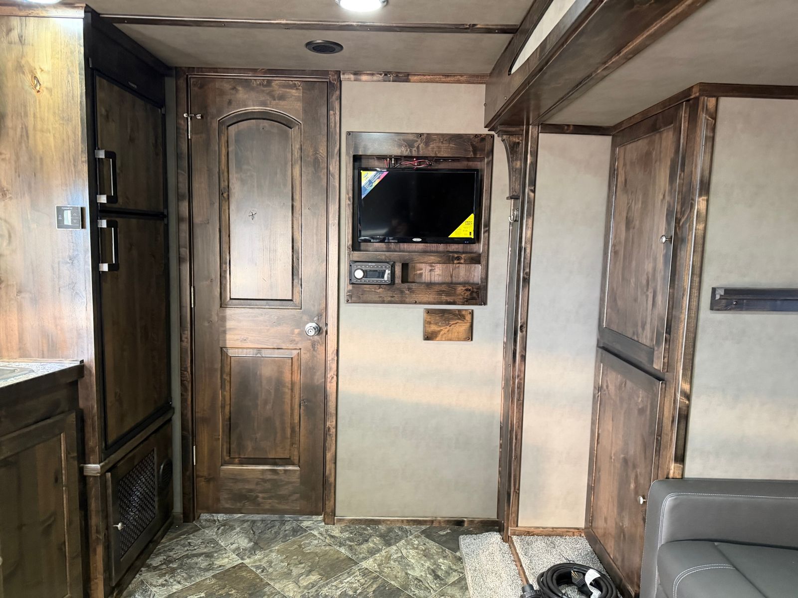 Trailer Has 16' Living Quarters Dual Seating, Sofa on Front Wall, Dinette in Slide Separate Bathroom Fridge, Cook top, microwave, TV Solid Wood Cabinets 18' Garage 2 Rollover Sofa Sleepers 2 Cabinets and shelf Fold Down Work Bench Oil Caddy Strap Holders Versa Track Full Length each Side