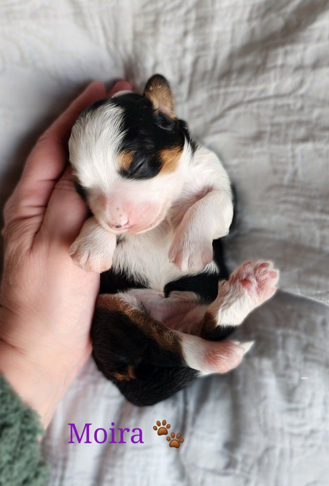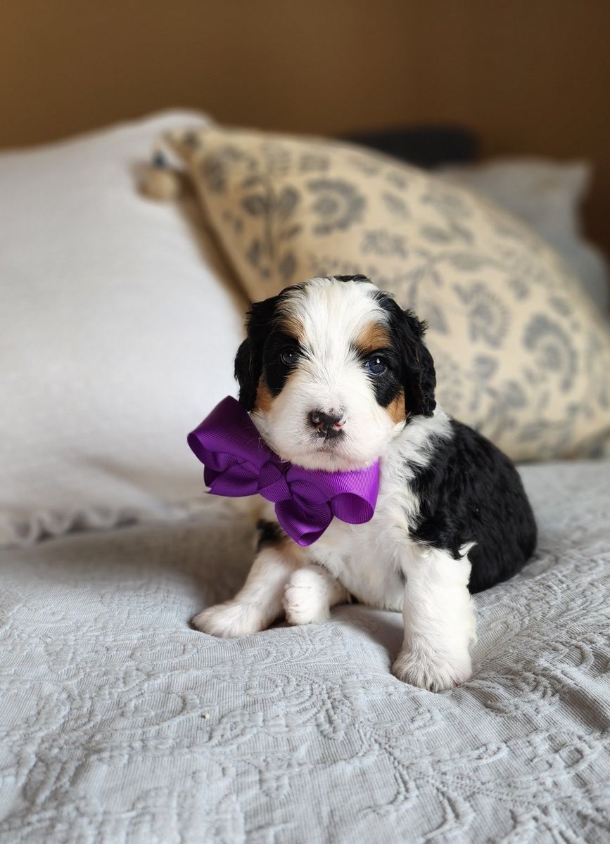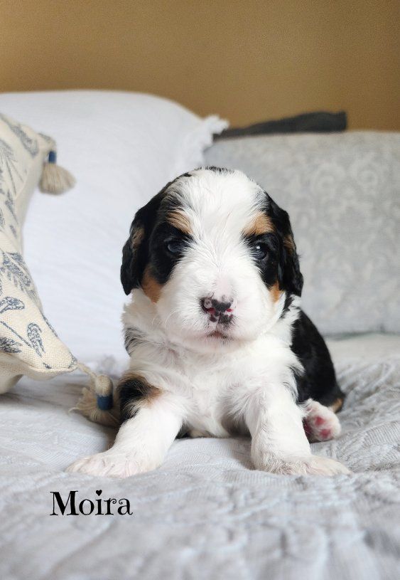 ZelleMeet Miss Moira 🤍 a beautiful female Bernedoodle with the classic, timeless look of a traditional tri-color and a gentle people connected temperament that makes Bernedoodles amazing companions. ️Her parentage has provided her with a blocky, yet compact build so many desire to own and what we as Bernedoodle breeders strive to produce. ️Paired with her blocky build is a soft fleece coat that is lush and wavy. ️Her coat type is easier to manage and your groomer will appreciate it. ️The icing on the cake is that she has the low/non-shedding coat inherent from her Poodle genetics that is easier on those with allergies.