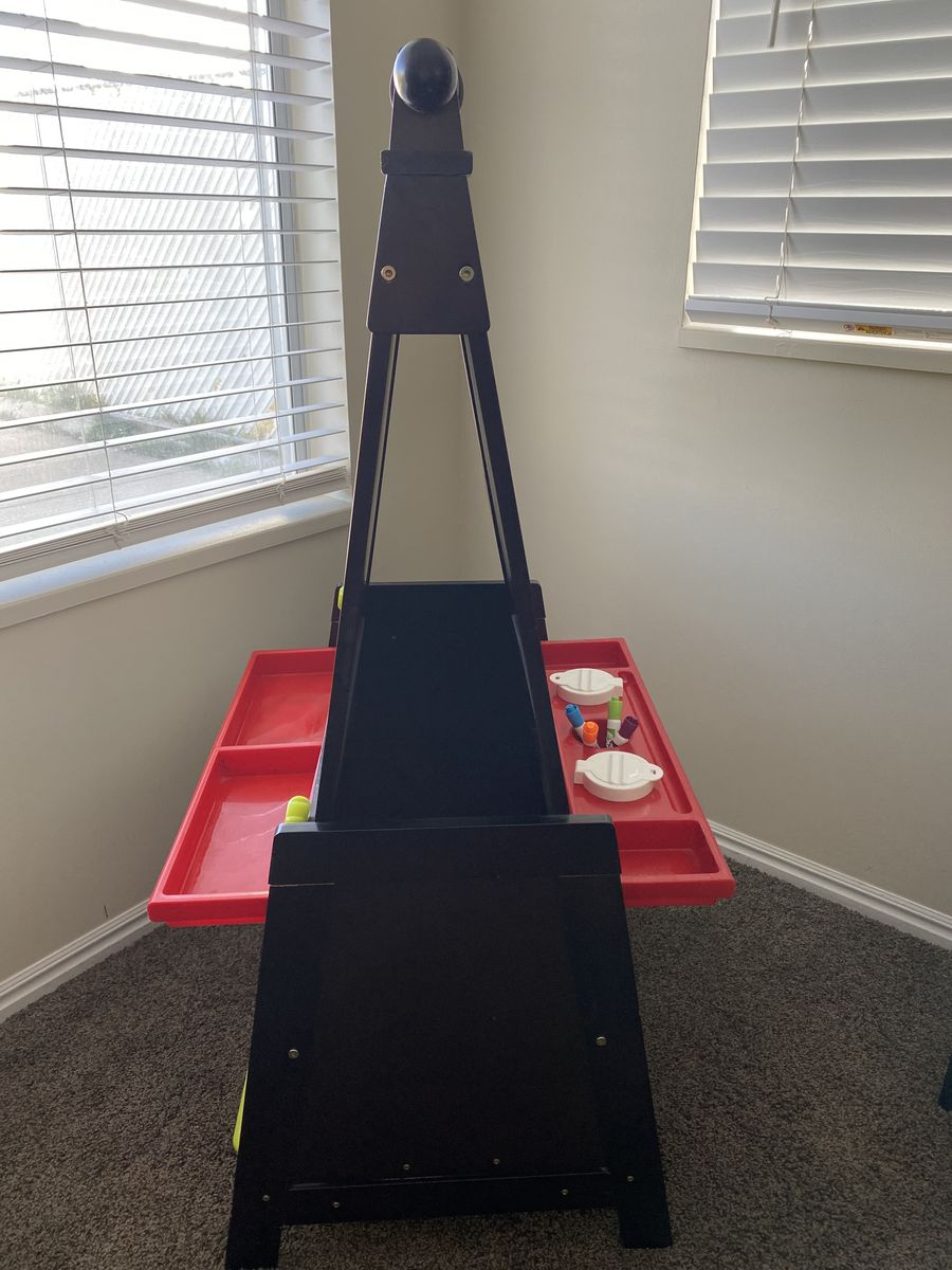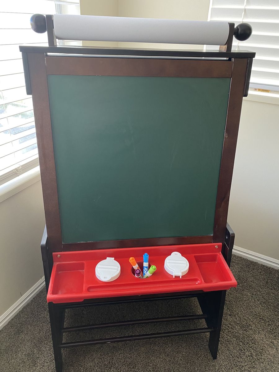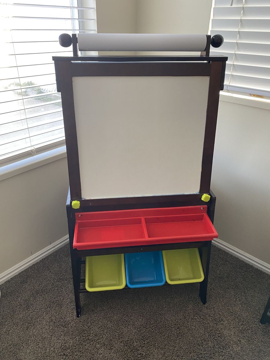 ZelleKids table with four chairs and matching easel chalkboard/ dry erase board. Normal wear- a few scratches. Selling as a set.