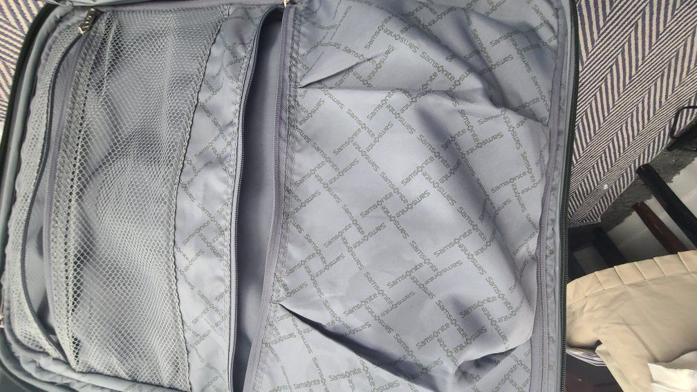 Expandable, Sturdy Samsonite-wheeled suitcase-Checked luggage Has a retractable handle and smooth-rolling wheels. Has handle to easily pick up and load. 2 Front pockets for easy access. Spacious main compartment with 2 pockets inside to keep things secure. Bottom is wider than top of suitcase. Easy to travel with Great for travel!