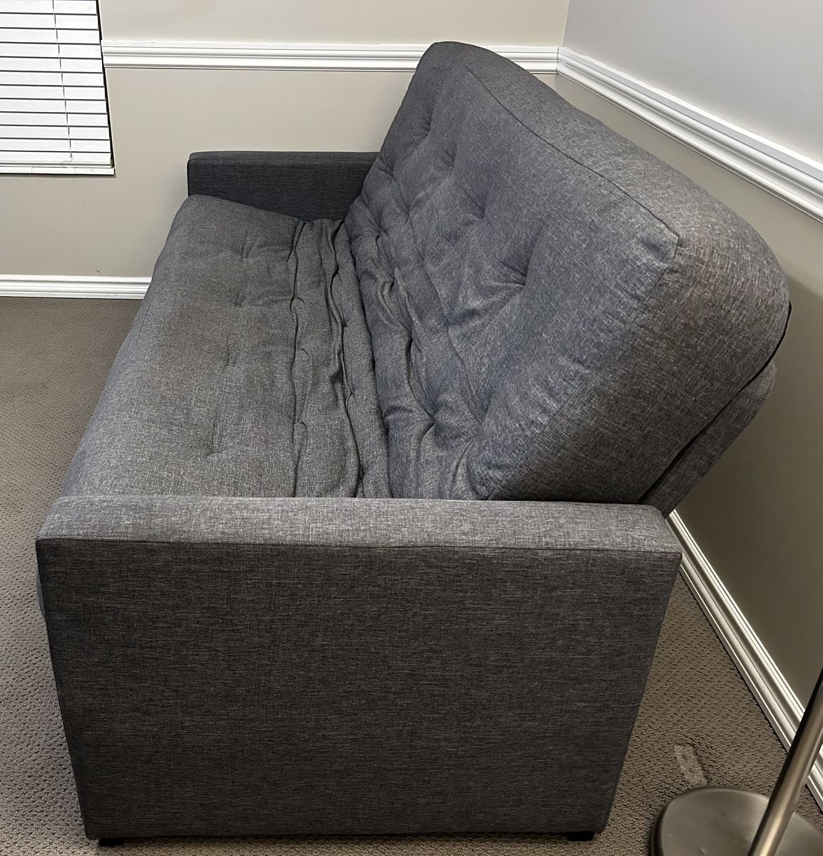 VenmoGreat condition just making changes Overall length 83 inches Height at bck of futon 36” Lays Flat for a bed, sleeping area Full size Mattress 75” long x54”wide
