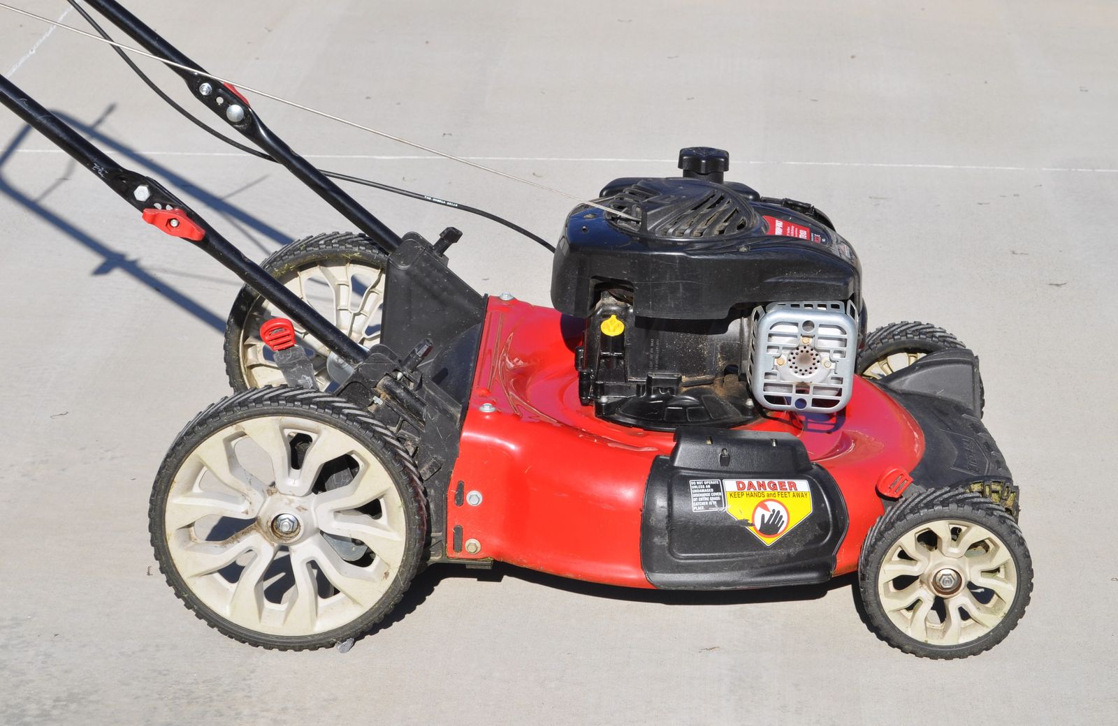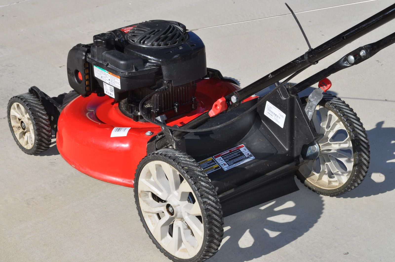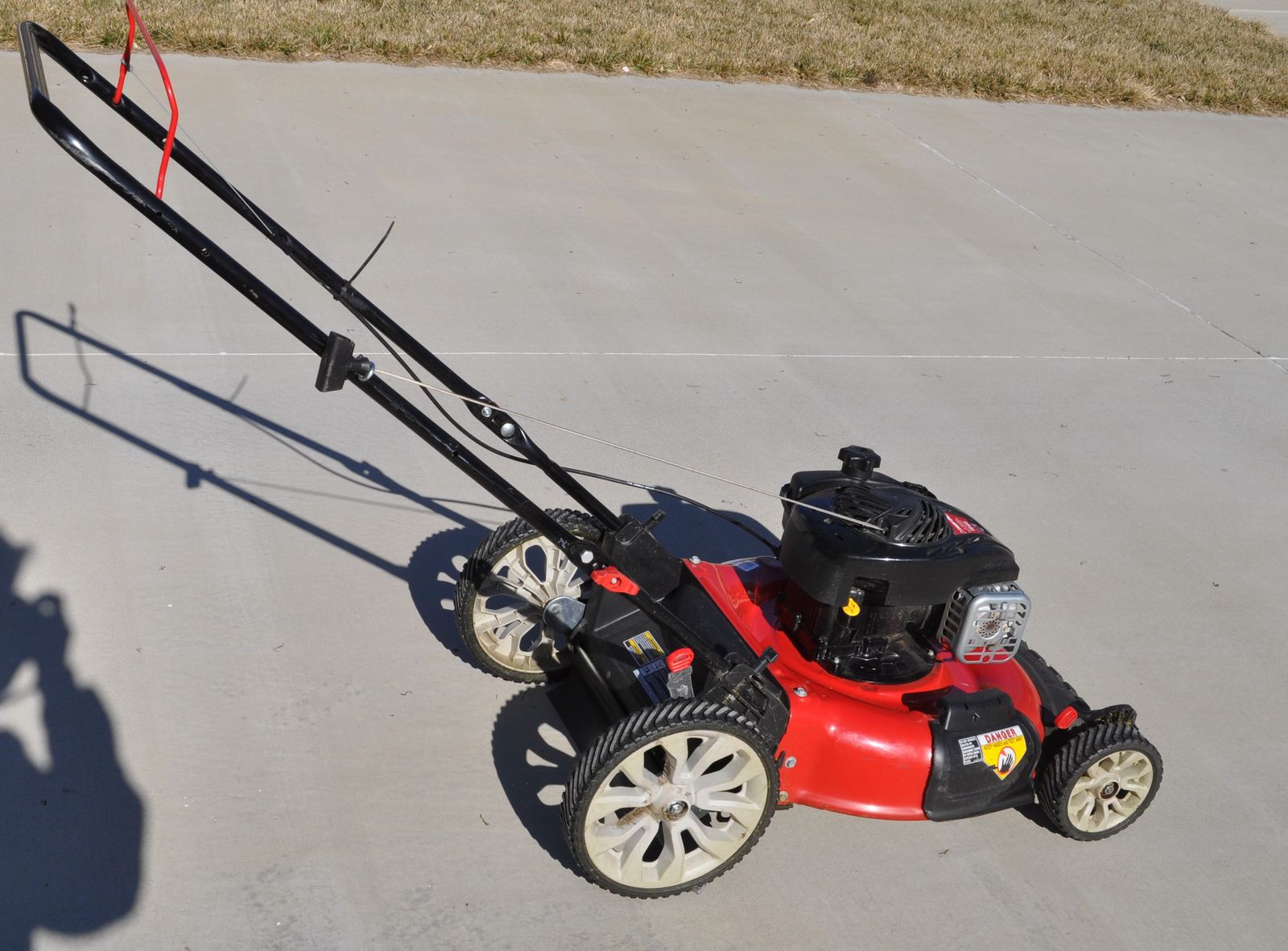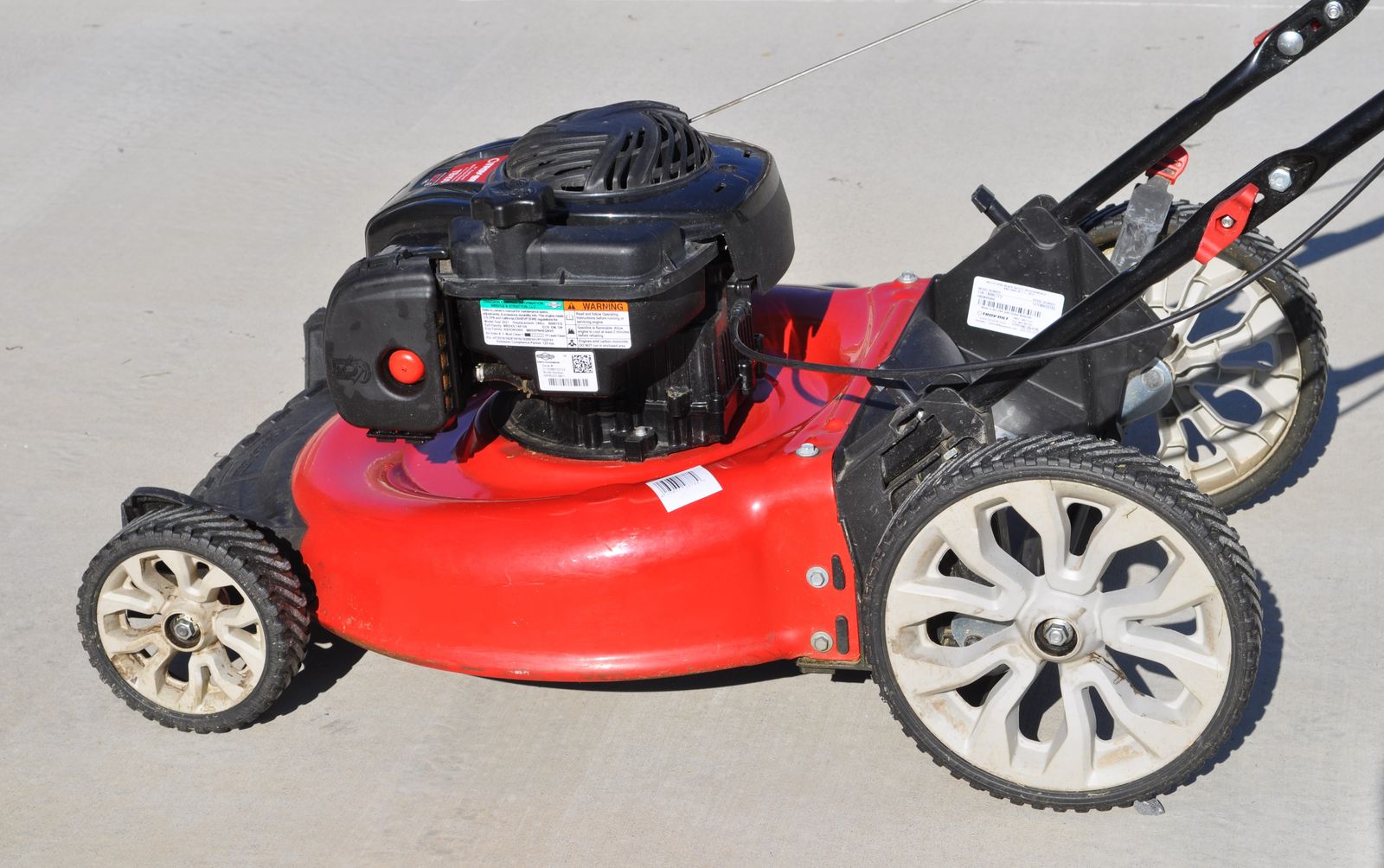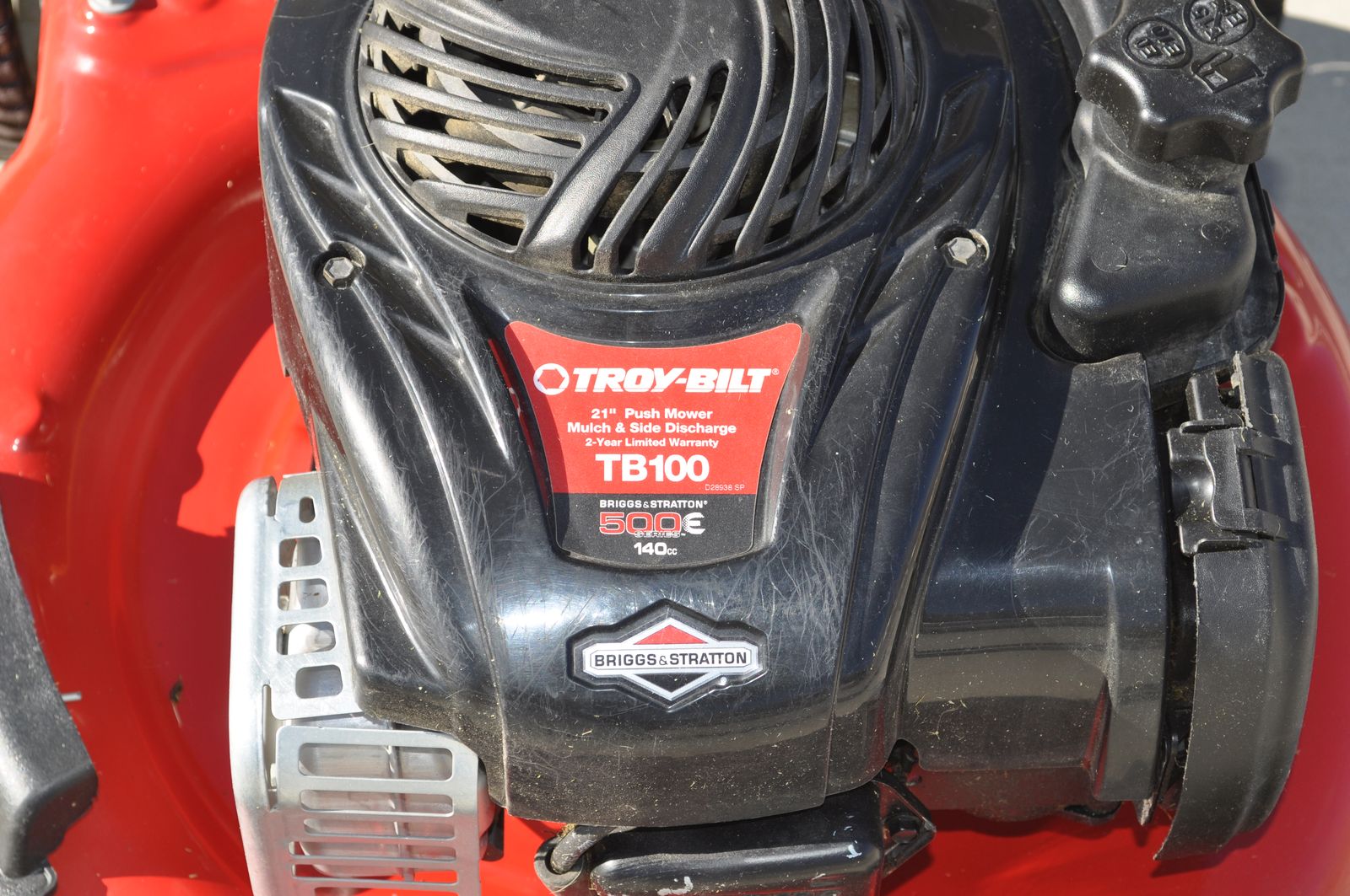 Troy-Bilt 21” push mower ($380 at Home Depot), 140 cc Briggs & Stratton motor, weight 65 lbs. It’s set up for mulching, but it also has a side discharge, but no bag. I used this mower on my home lawn the past 3 ½ years (about 60 hrs run time), it runs great (just bought a self-propelled mower because of health issue). Each year I change the oil, sharpen the blade, and clean the air filter, only used ethanol free gas. Manual is included. Cash only.