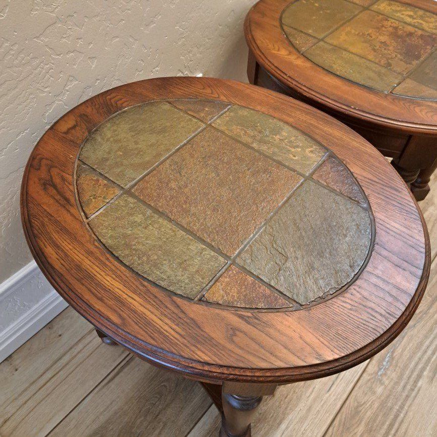 VenmoSolid wood end tables with slate tile tops in great condition. Very sturdy and well built. No wobbling. Slate tops are great for drinks without worrying about water rings. Normal wear consistent with age, but overall very clean. The width of the tops measures 26 by 22 inches, and they are 23 inches tall.
