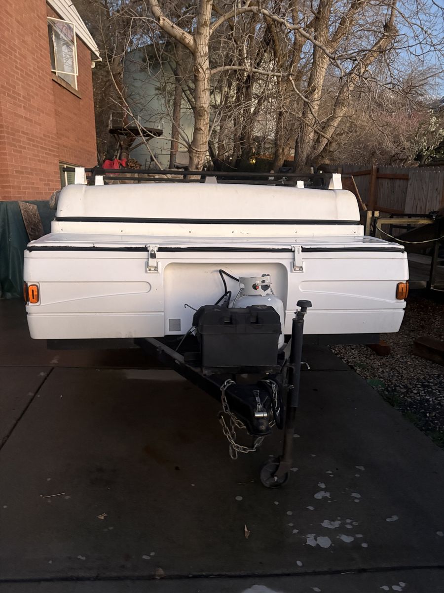 2queen size pull out beds, optional bed over the kitchen table area, kitchen sink and stove, dinning table area, refrigerator, heater, hot water heater, plenty of inside storage under cushions benches and cabinets, separate storage compartment in front, roof rack, new heavy duty leveling jacks, new tires, 2 propane hook ups, battery box, optional outside stove and side wall mount, awning, rear hitch for bike rack or for storage rack. Trailer is in great shape for its year and has not had a lot of use. I have maintained it well over the years and are the original owners, let me know if you have any questions, it is ready for camping!