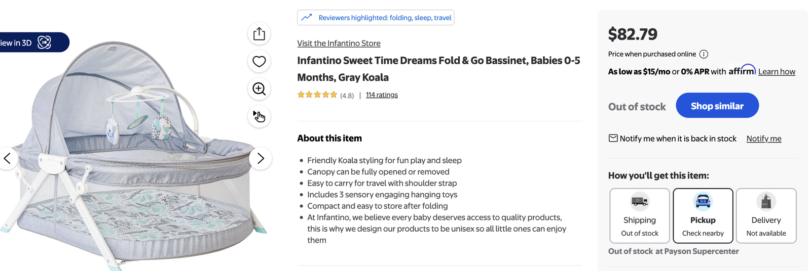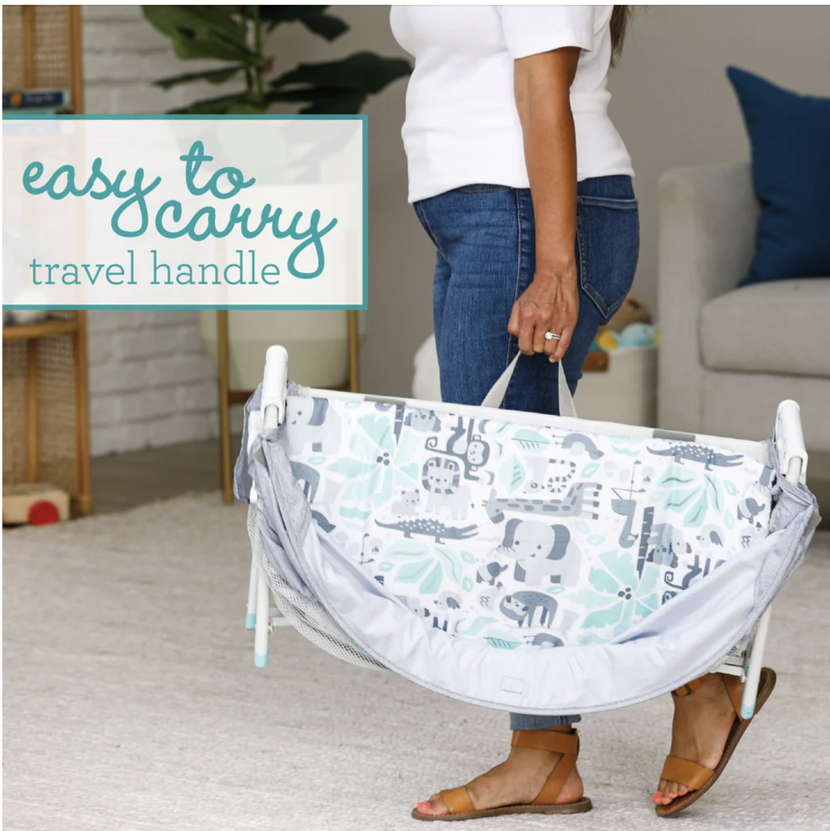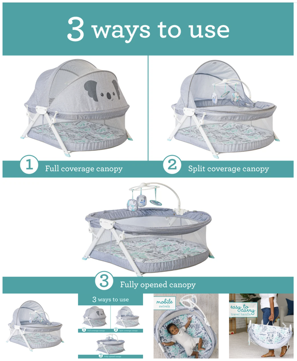This smartly designed bassinet is easy to set-up and take on the go! The koala styling creates a fun environment for baby. A wrap-around mesh enclosure keeps baby in sight for parents and a full-cover canopy offers both shade and bug protection for baby. Three hanging toys on an overhead mobile keeps busy little hands entertained during playtime. A removable and machine-washable soft mat makes napping and playing extra comfy in the Sweet Dreams Fold & Go Bassinet. This versatile bassinet by Infantino is compact and easy to fold and store.