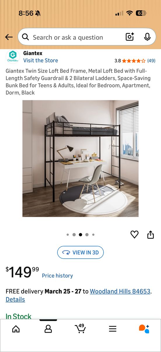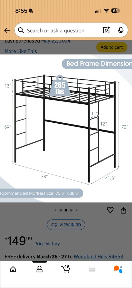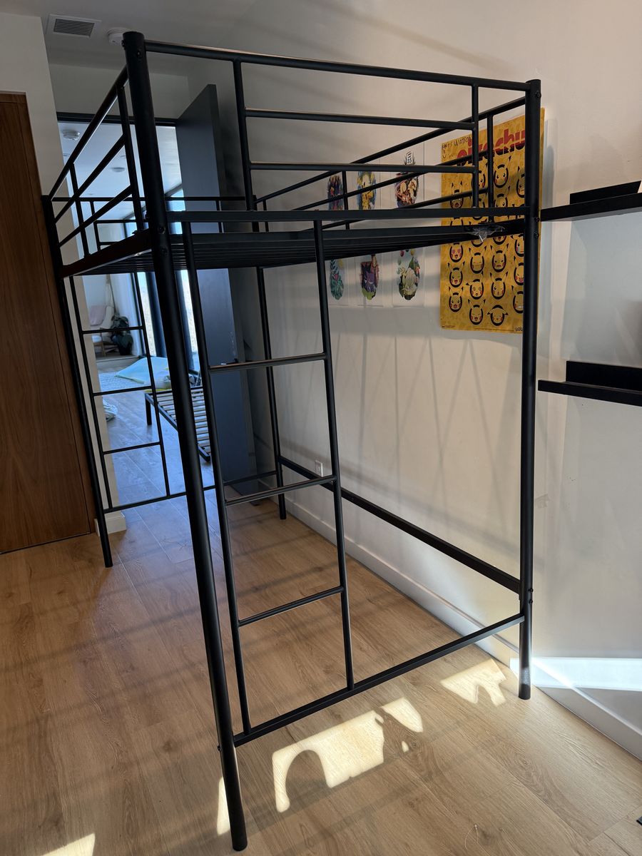 ApplePayTwin sized loft bed frame perfect for kid’s room to save space! Dimensions are on one of the pictures. Super solid and in good shape (a bit of residue from stickers we peel off from kids). One of the bolts stripped a bit when we were taking it apart. It’s in 3 parts now so it will super easy to transport and reassemble. Let me know if you have any questions!