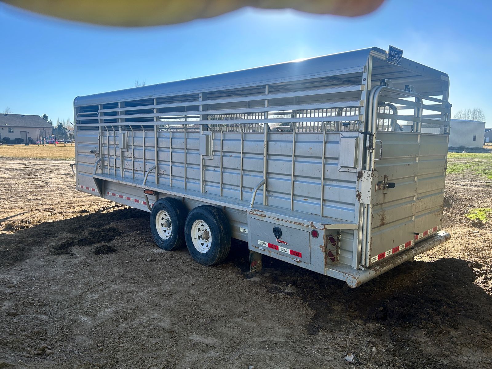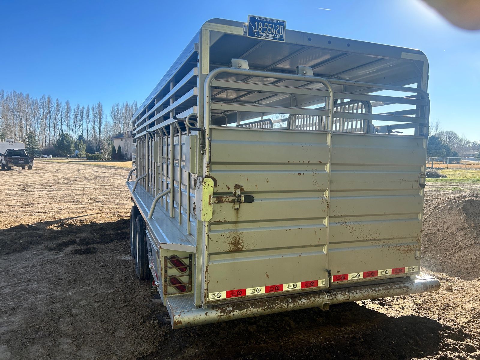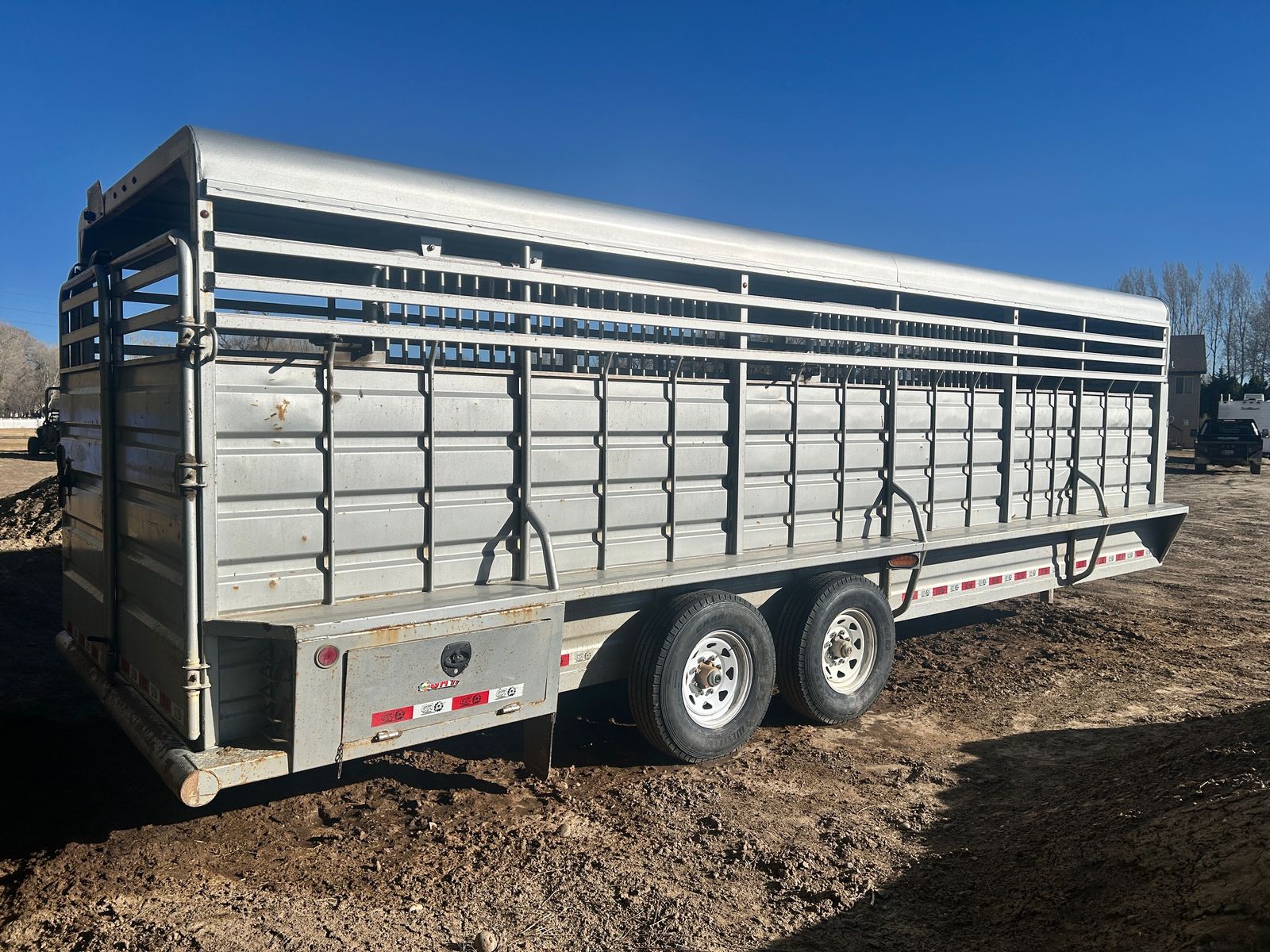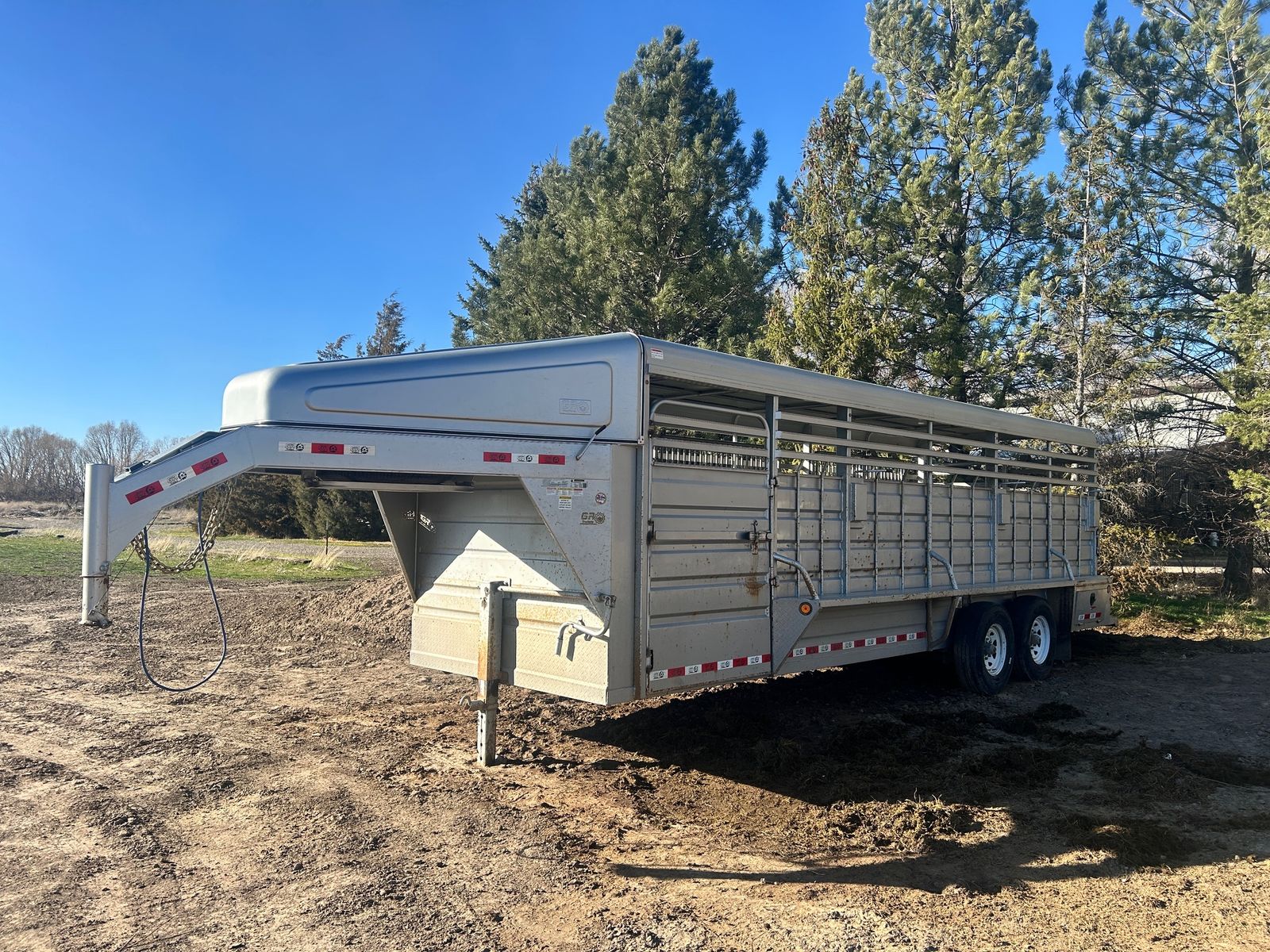 2023 GR 6’8”x24 Gooseneck Stock Trailer, 7k axles, rubber cleated floor, slotted for easy clean out, 2 center divider gates, one with slide, above gooseneck lockable storage, sliding rear gate with slam latch, rear storage boxes, LH front swing out door. Tires and brakes are in great condition. Comes with spare tire. Good solid stock trailer. Delivery option available.