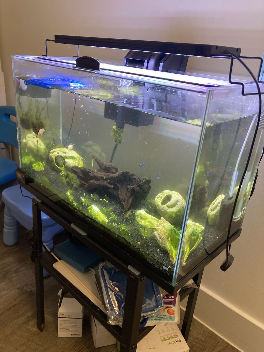 10 gallon Fish tank with all the accessories: filter, lamp, heater, grass, wood etc..
