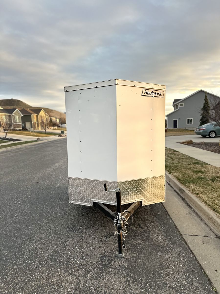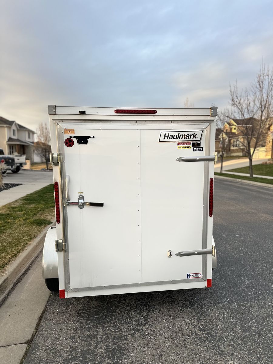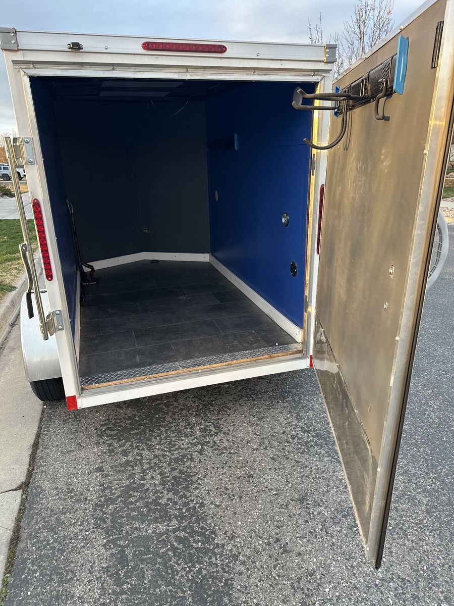 VenmoThis is a great little trailer that we have used for a few different things. It hauls a couple dirt bikes very easily and has primarily been used to haul some window washing equipment most of the time. It is in great shape. The floor is a skid resistant rubber that is quite durable. There are some hooks internally to tie things down and hang things up on the wall. No dents, scratches or dings anywhere on the trailer. It takes a normal 2” ball. This tows very straight and is super light. I can lift it up and off the hitch if I need to. Internal dimensions: 5.5ft wide 5.5ft tall and 9ft2” long Door opening is 5x5