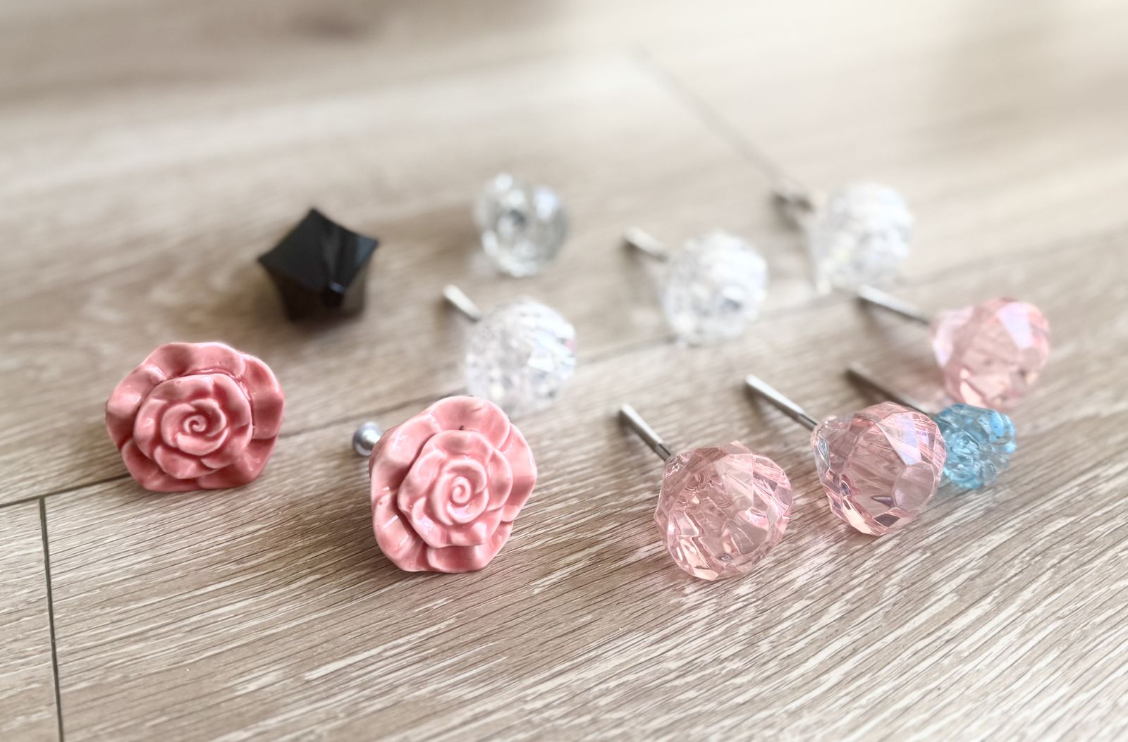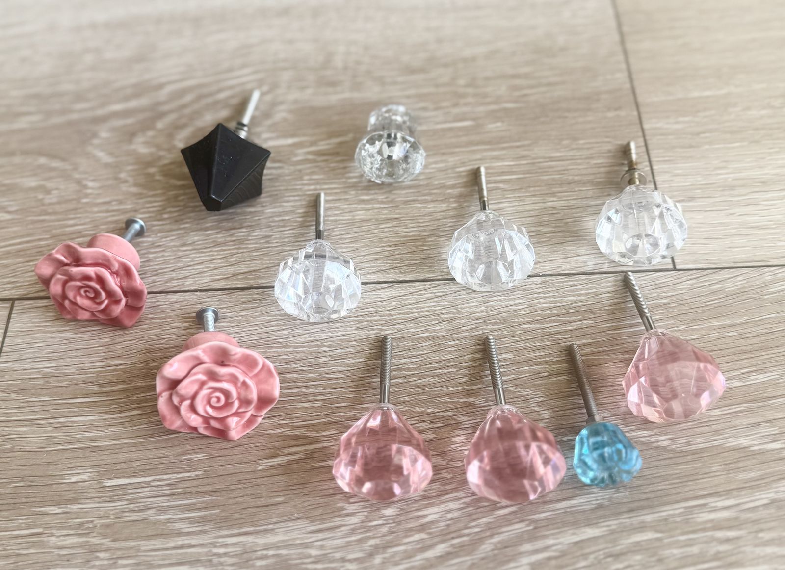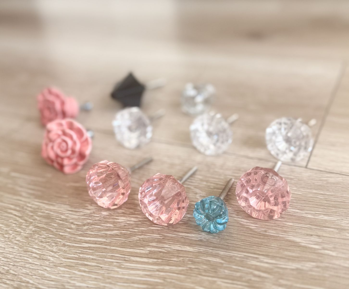 Girl’s Room | Country Cottage | Shabby Chic | Kitchen Cupboard Handles | Cabinet Handles | Dresser Hardware | Bedroom | Chest of Drawers | Remodel | Style | Stylish | Home Renovation | Furniture Flipping | Furniture Restoration | Kitchen Remodel | Bathroom Remodel | Pink | Clear | Floral | Adorable | Country | Cottage | Assortment