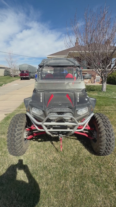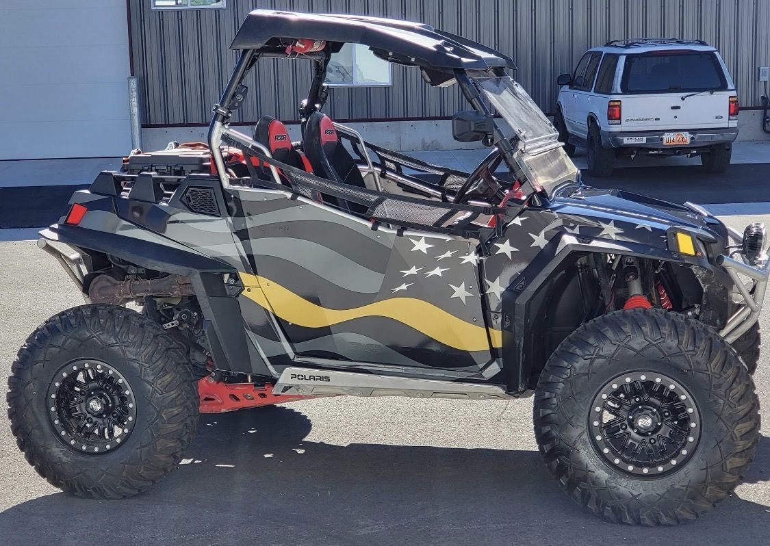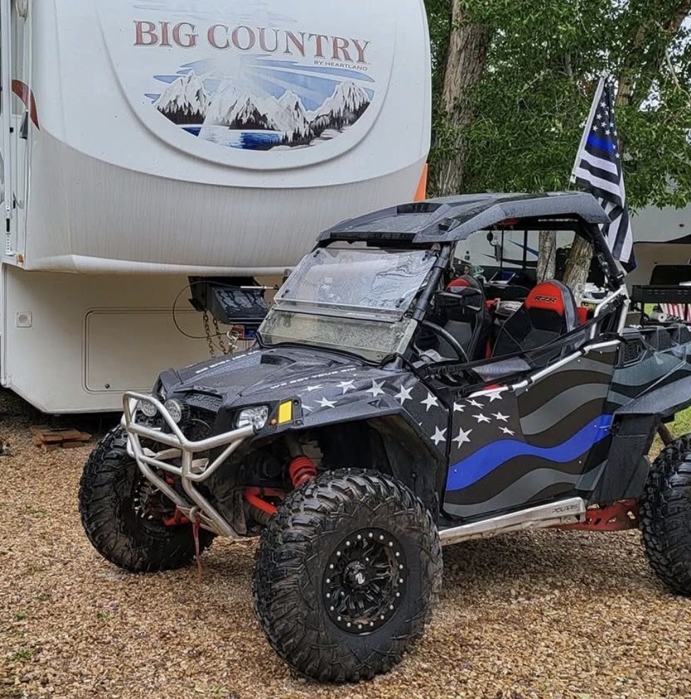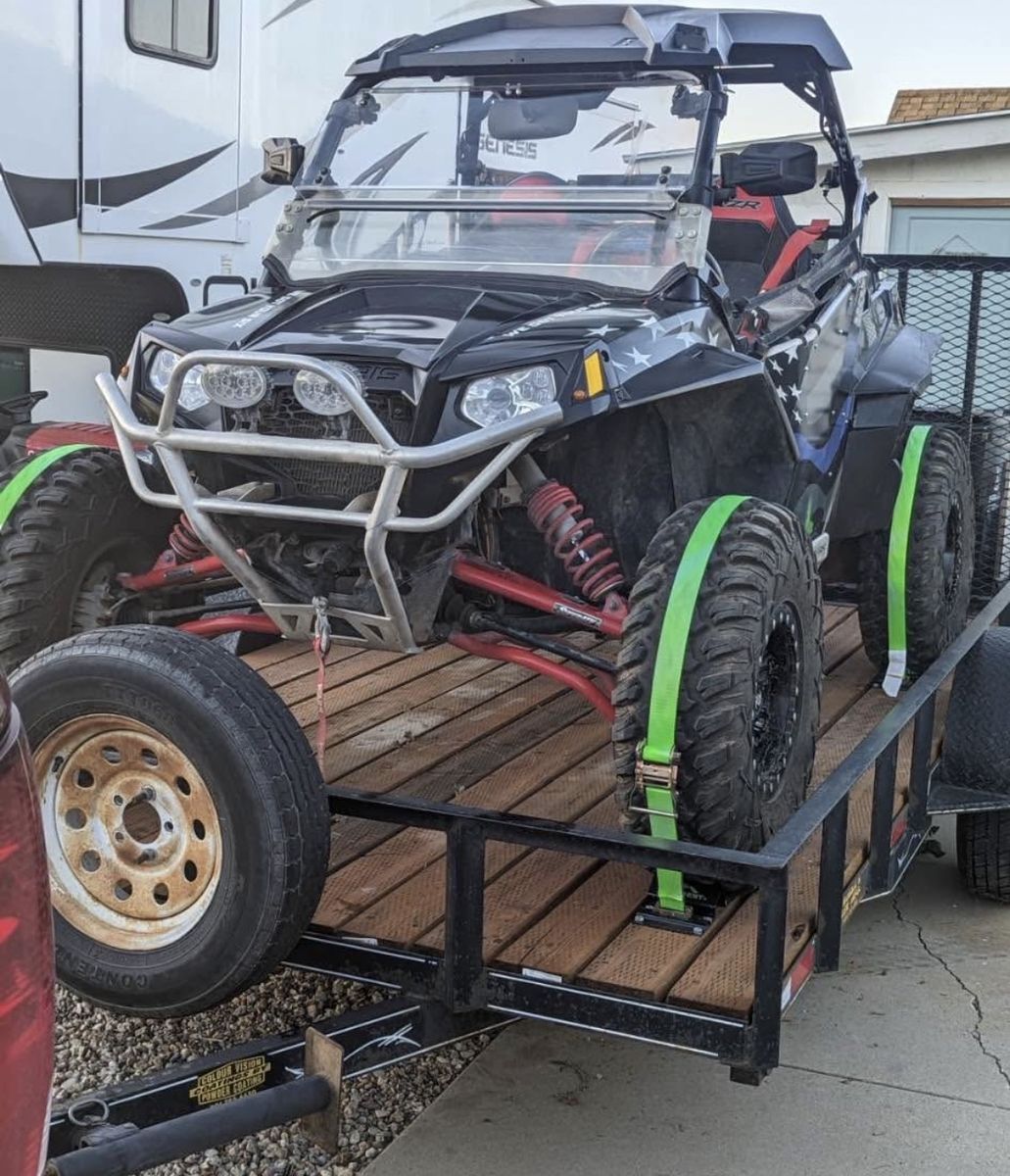 32” Tusk terabyte tires, tusk bead lock rims, gear reduction, new belt and spare, roof top stereo, sound bar, dual lighted whips, Gibson dual tip muffler, street legal kit, LED spot lights, winch w/remote, knee pad door bags, all high clearance suspension, shocks rebuilt last year, full metal skid plate, rock guards and 2” wheel spacers. Includes flatbed trailer, blocks and straps.