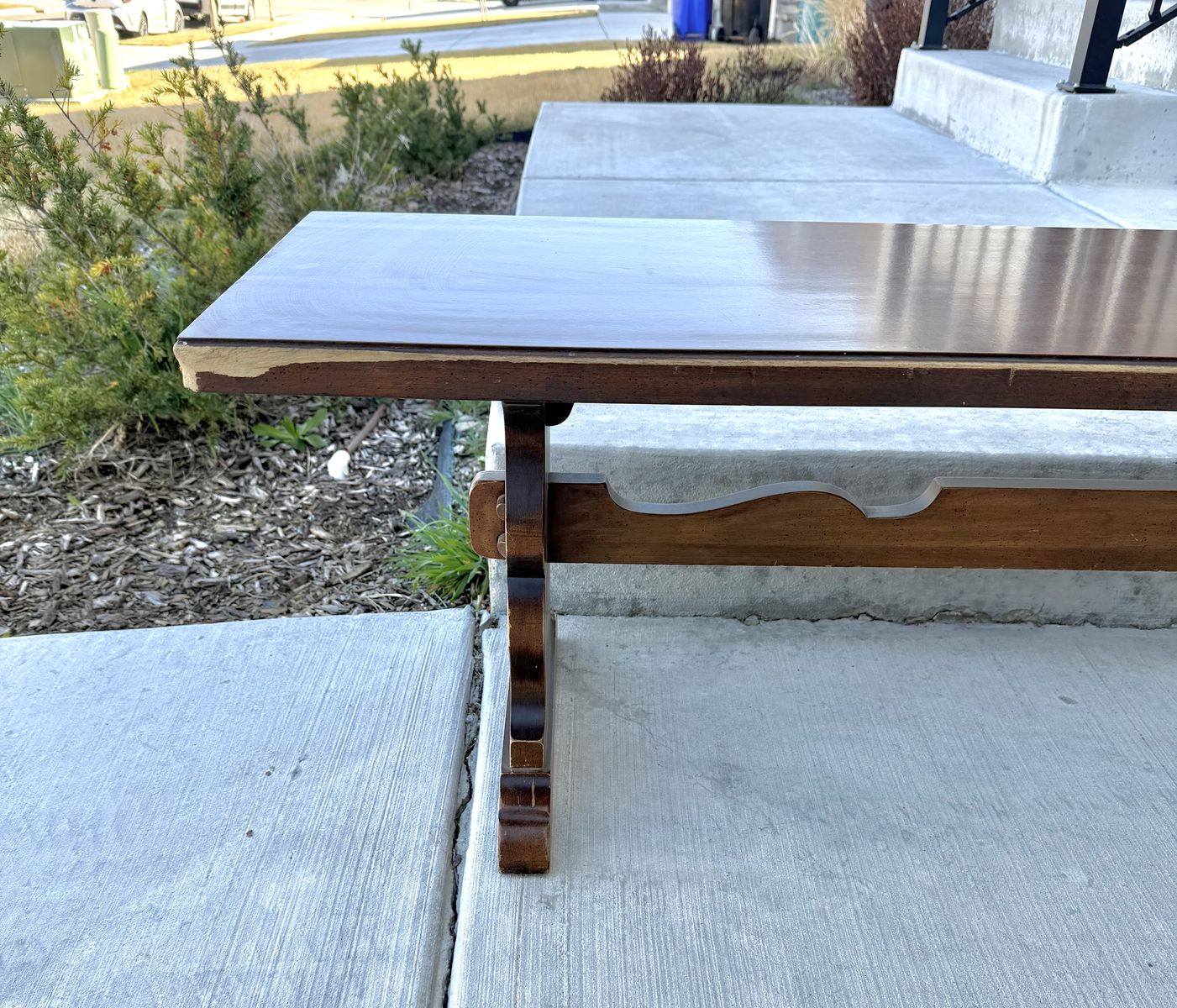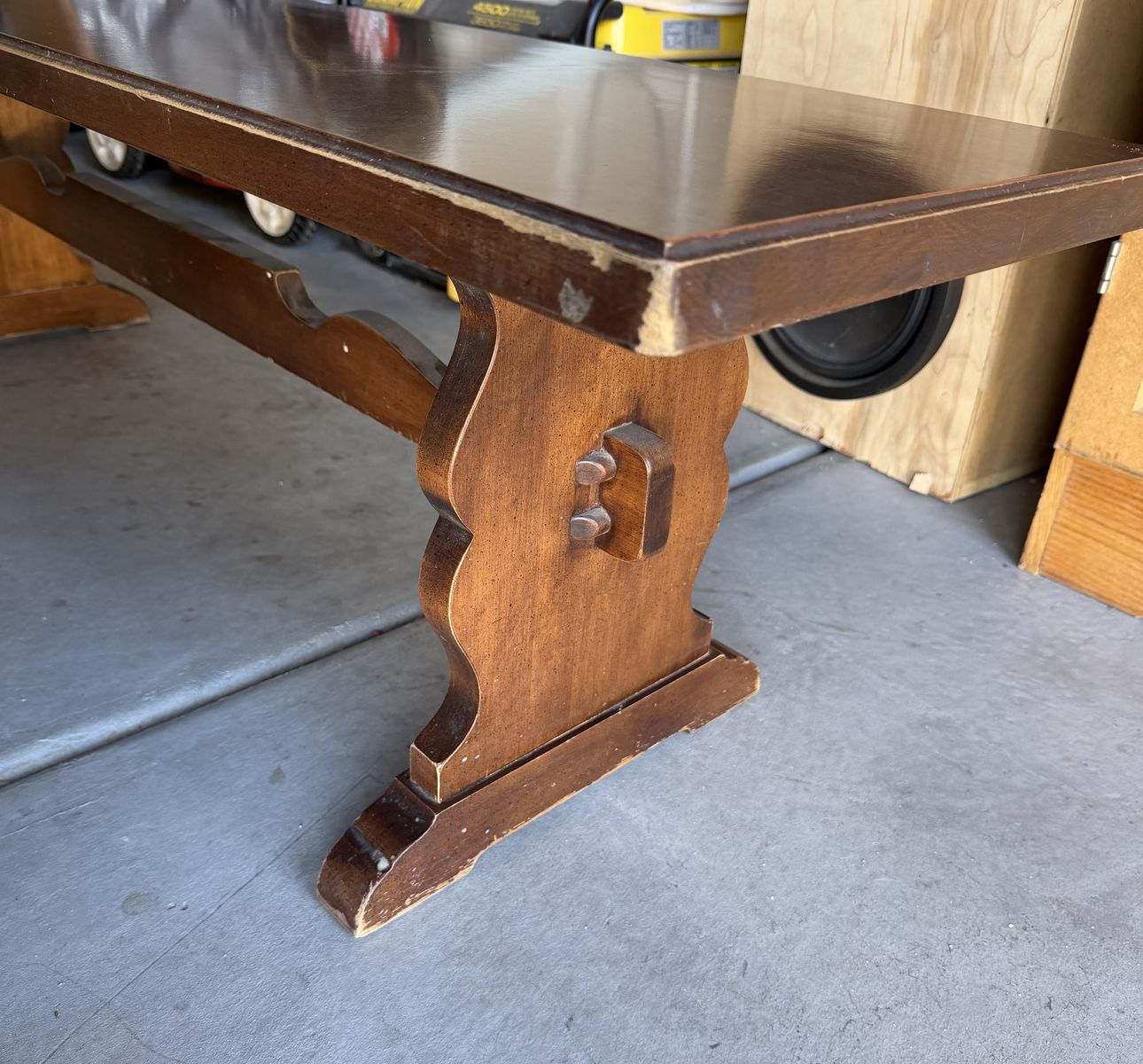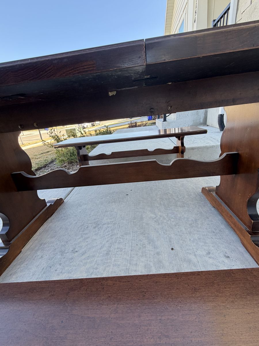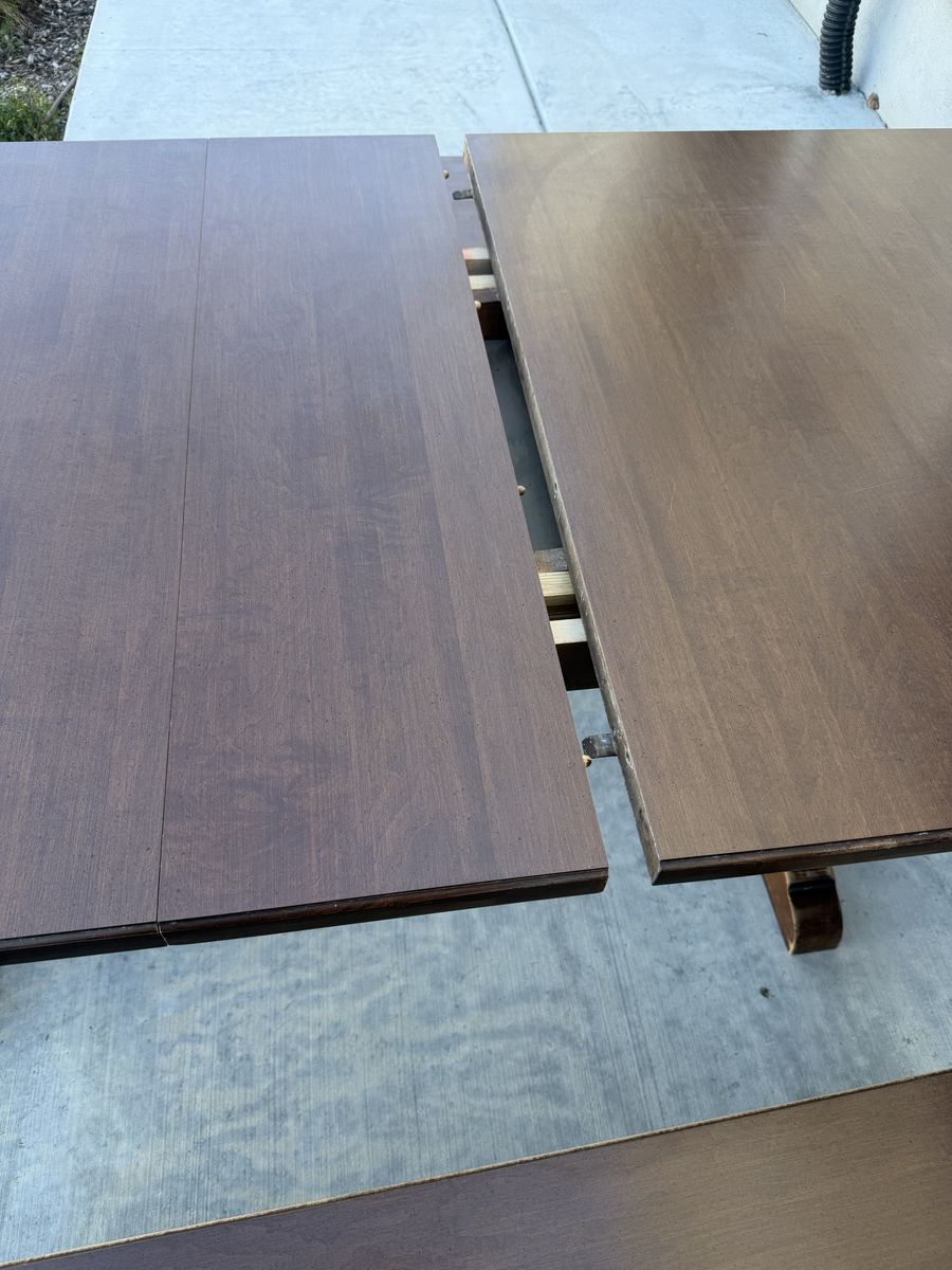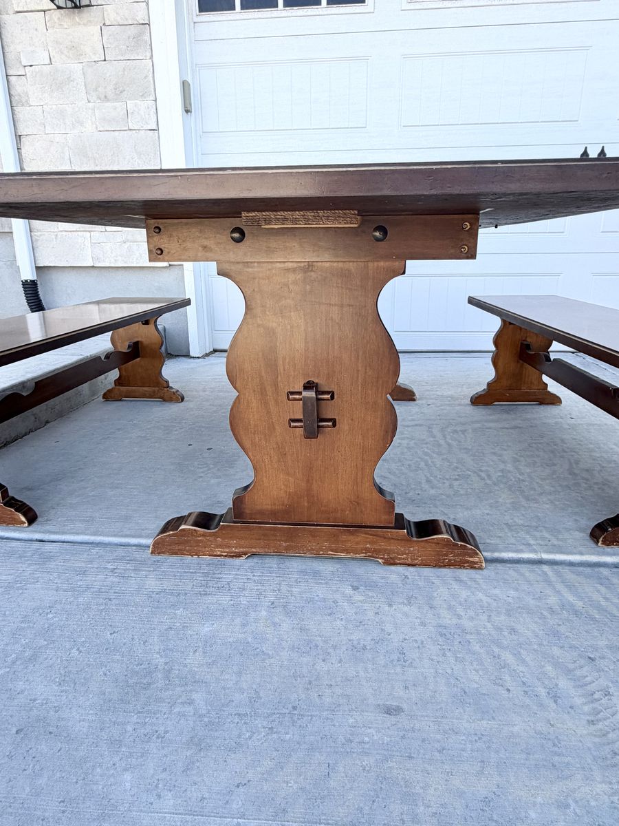 VenmoSolid wood/heirloom quality dining set from Tell City Chair Company (1950s-1960s). Vintage farmhouse vibes, matching trestle table and benches. There are signs of wear due to age, I tried to show the best I could in pictures. Table top and bench(es) tops are in really good condition, with some light scratching. Measurements below: