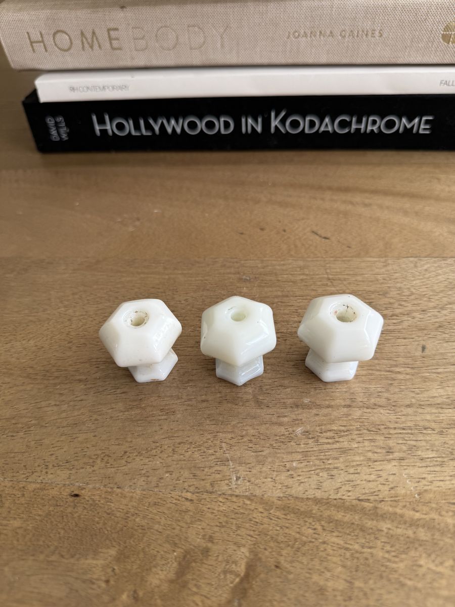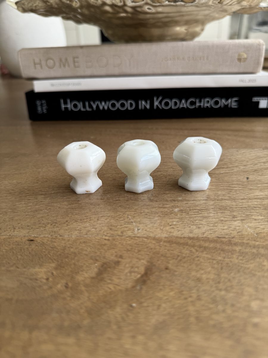 VenmoSet of 3 | Vintage | Depression Era | OPAL MILK GLASS WHITE | Hexagonal Glass Knobs | Pulls | Dresser | Cabinet | Hardware-$15 for all