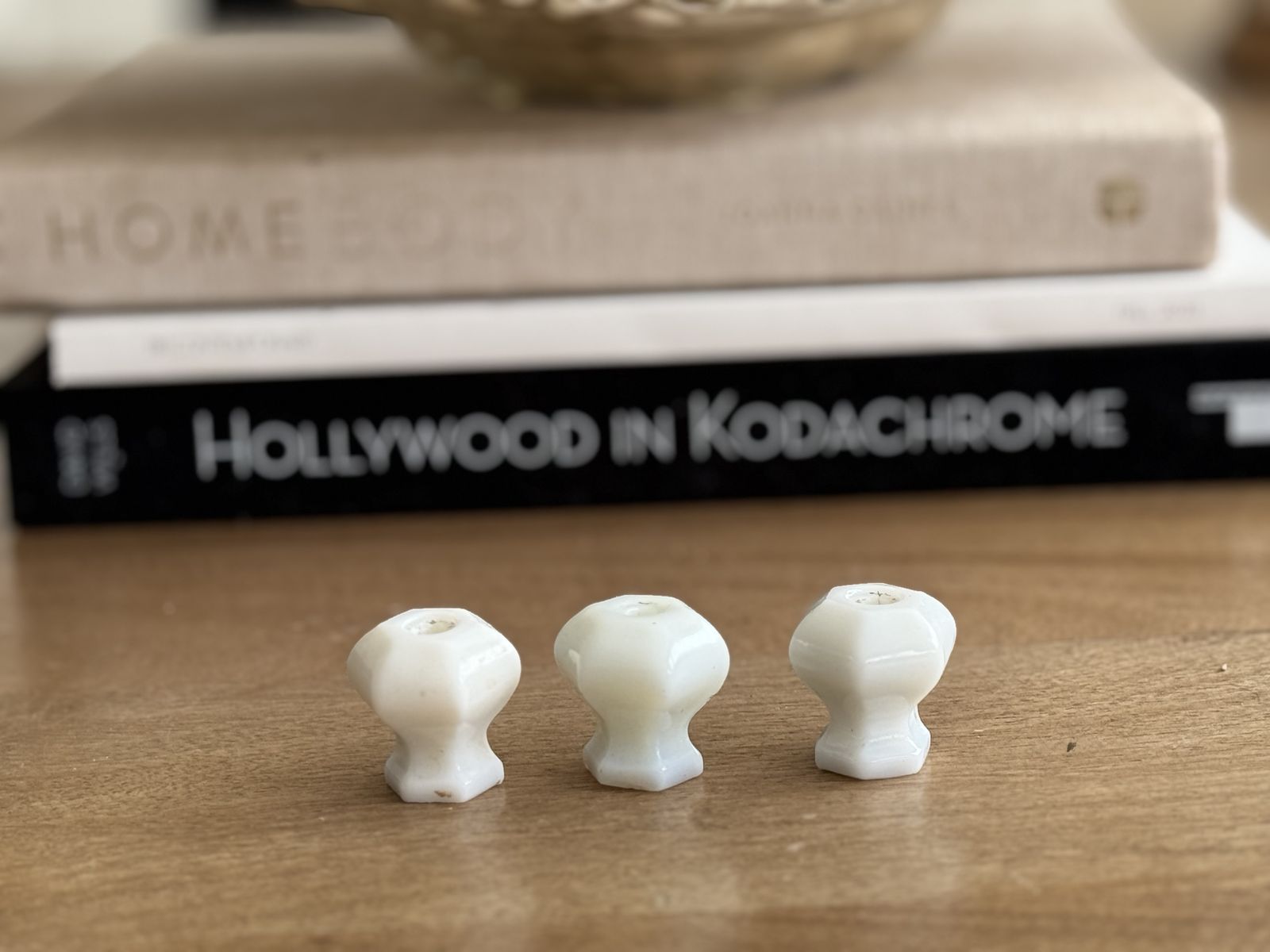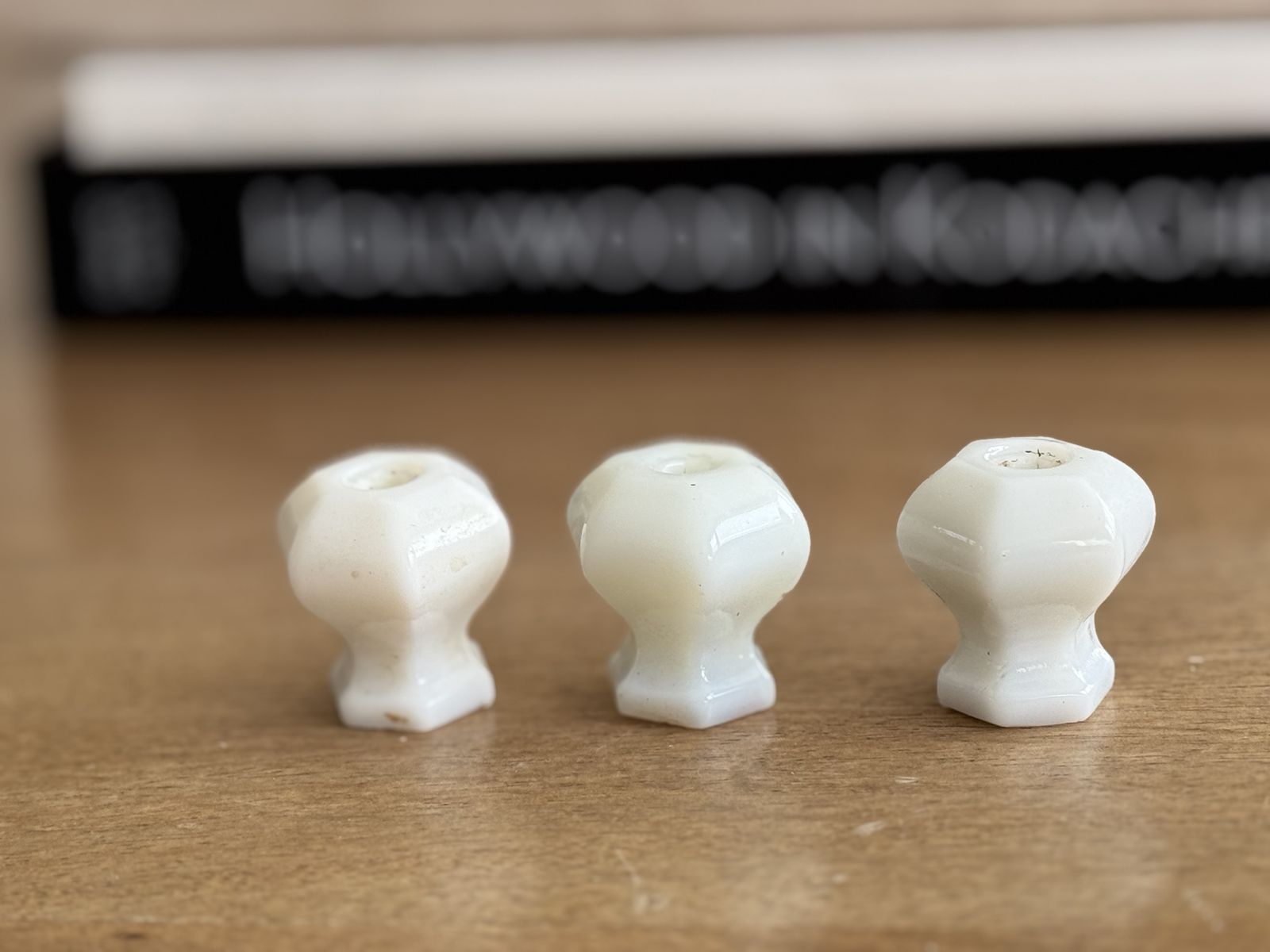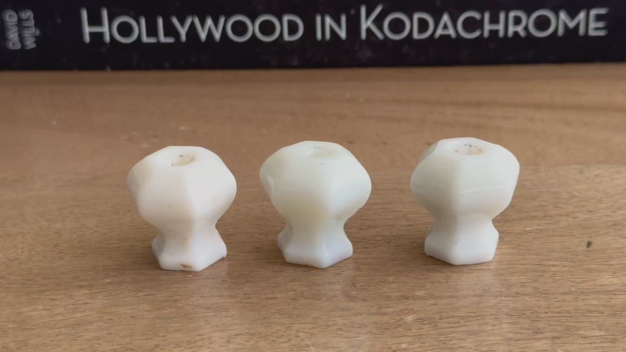 Set of 3 | Vintage | Depression Era | OPAL MILK GLASS WHITE | Hexagonal Glass Knobs | Pulls | Dresser | Country Cottage | Shabby Chic | Kitchen Cupboard Handles | Cabinet Handles | Dresser Hardware | Bedroom | Chest of Drawers | Remodel | Style | Stylish | Home Renovation | Furniture Flipping | Furniture Restoration | Kitchen Remodel | Bathroom Remodel | Adorable | Country | Cottage | White | Aged Patina