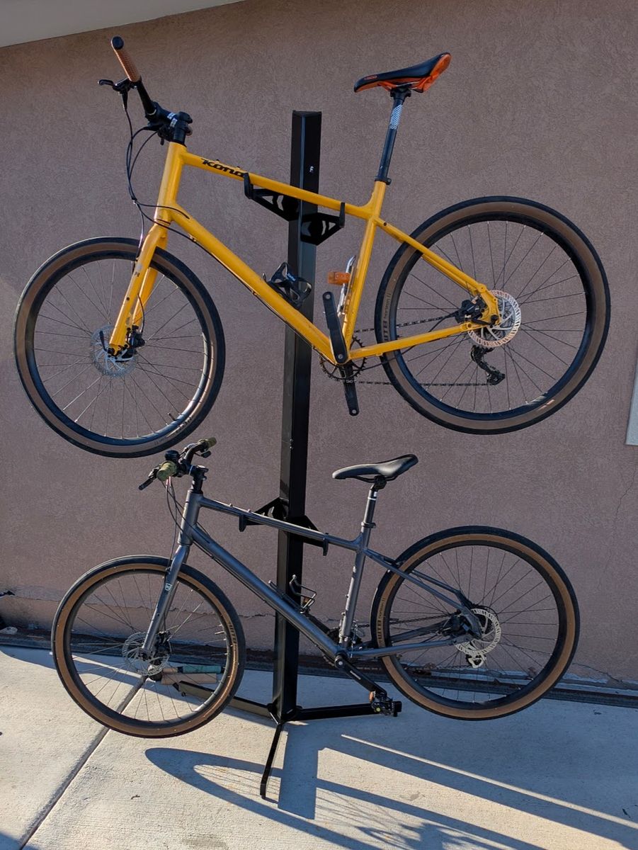 The Velo Cache is a free-standing, vertical bike storage tower that holds two bikes, with the capacity to expand and hold four bikes. It's a timeless, high-quality, versatile bike storage concept for small indoor spaces. Soft rubber cradles protect your bike’s finish, making the Velo Cache the best space-saving storage solution for expensive road, cyclocross, mountain and electric bikes.