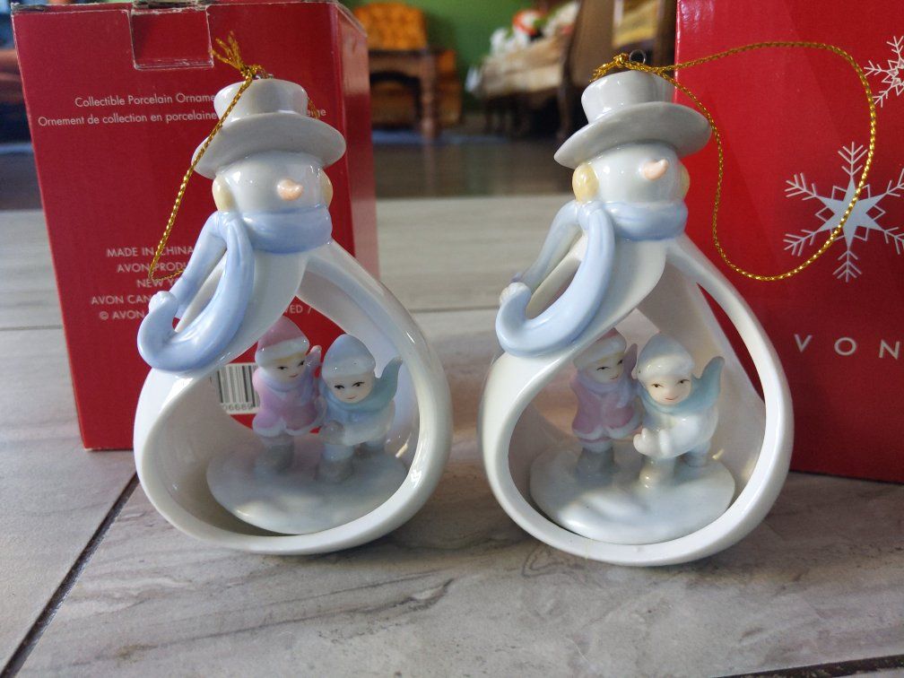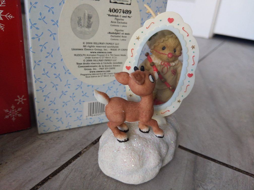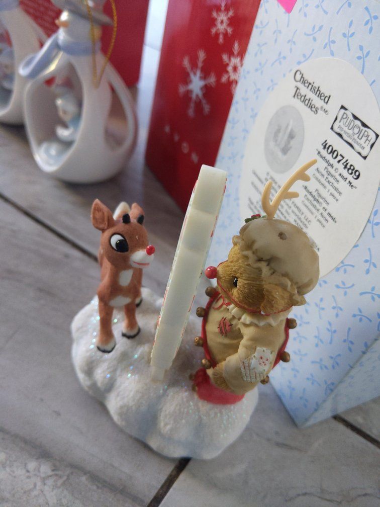 VenmoAll for the price. Cherished Teddies Rudolf electric music box sings "Rudolph the Red Nosed Reindeer" and is working but is missing an antler. The two Avon snowman ornaments are the same.
