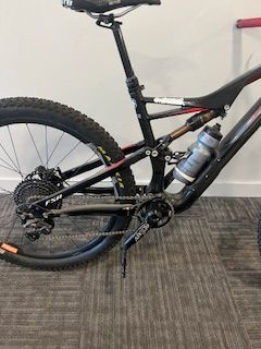 Great specs: Sram Guide RS Brakes, Specialized Command dropper, XT shifter and rear derailleur, and E*Thirteen TRS crankset. X-Fusion Sweep fork (160mm) and Fox float out back, yielding 150mm of travel through Specialized’s patented FSR design.