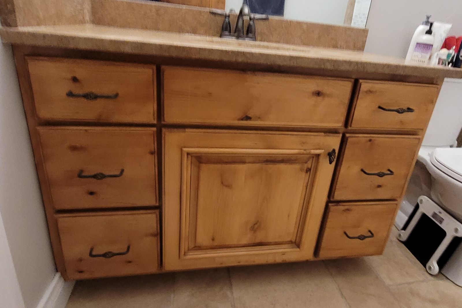 The counter top is 47.25" wide and 22" deep, the cabinet itself is 46" wide. In good shape just redid my sons bathroom and don't need it anymore. It is all removed and ready to go. The cabinet fronts are real wood so could be done.Counter top is some king of polished stone. Sink is Kohler and faucet is Moen (faucet is included)