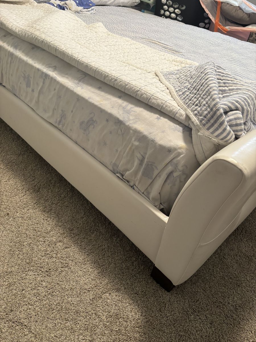 Venmowhite “leather” platform bed. includes mattress. height of headboard measures 35” tall and height of mattress measures 18” high.
