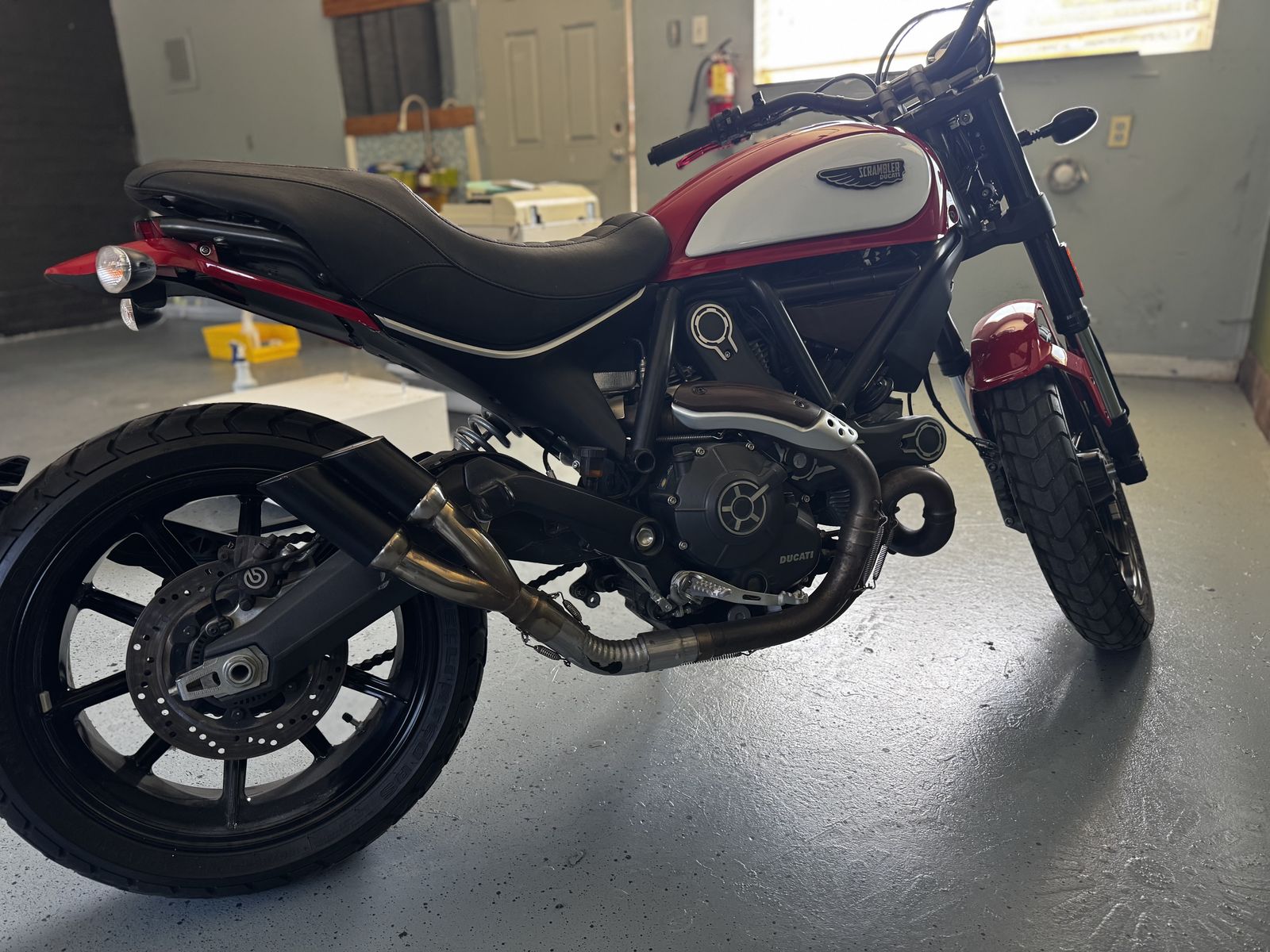 Upgrades & Maintenance: • Aftermarket Exhaust: Gives it that signature Ducati growl without being obnoxious. • Aftermarket Seat: Significant comfort upgrade over the stock unit for those longer canyon rides. • Front Tire: Great tread remaining. • Rear Tire: Getting low; will likely need a replacement soon (priced accordingly).