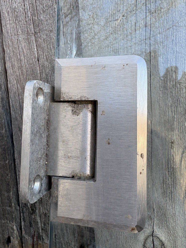The hinges swing in and out, they are spring loaded. The glass is 3/8 inch thick.