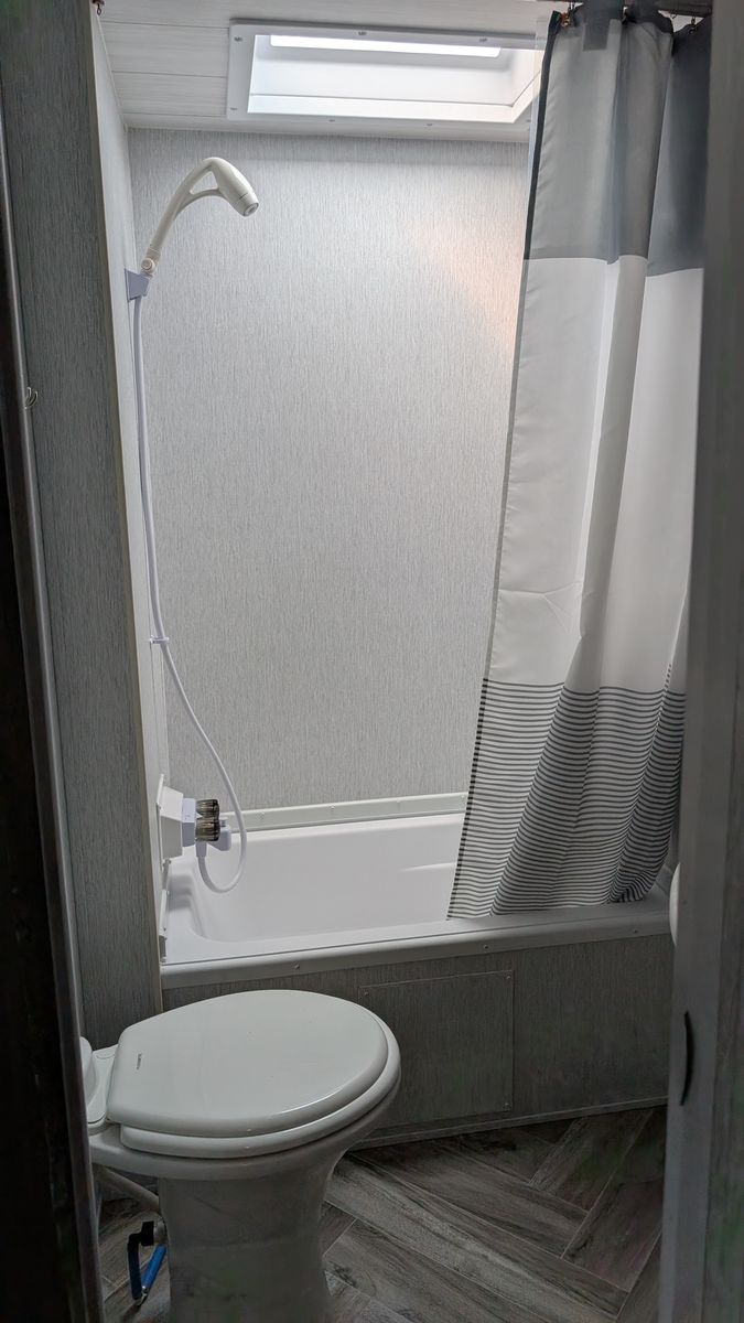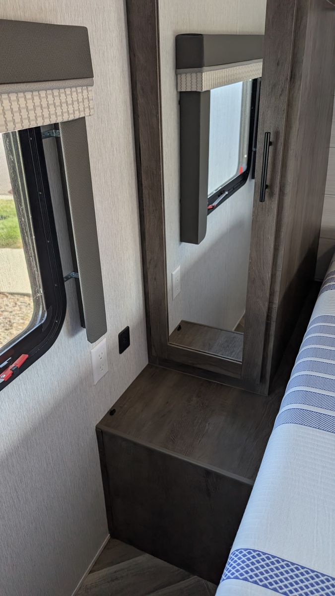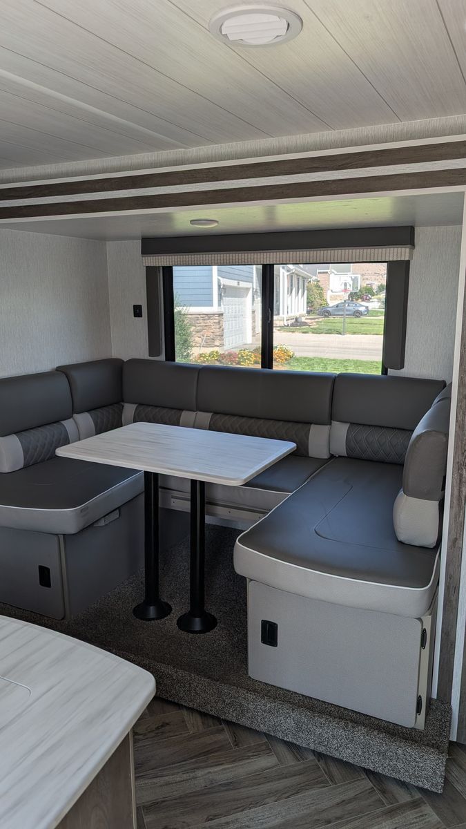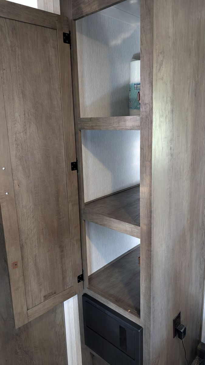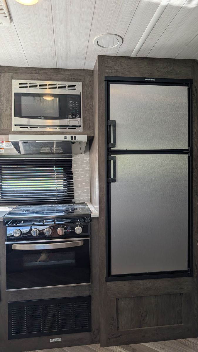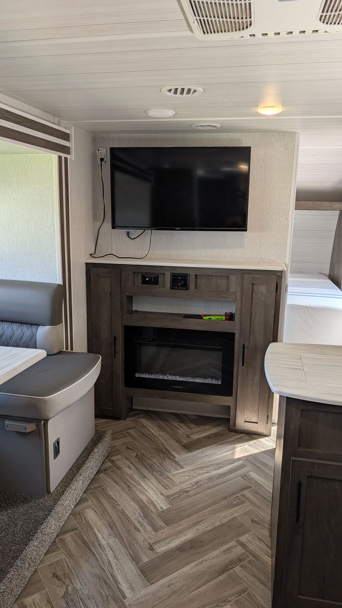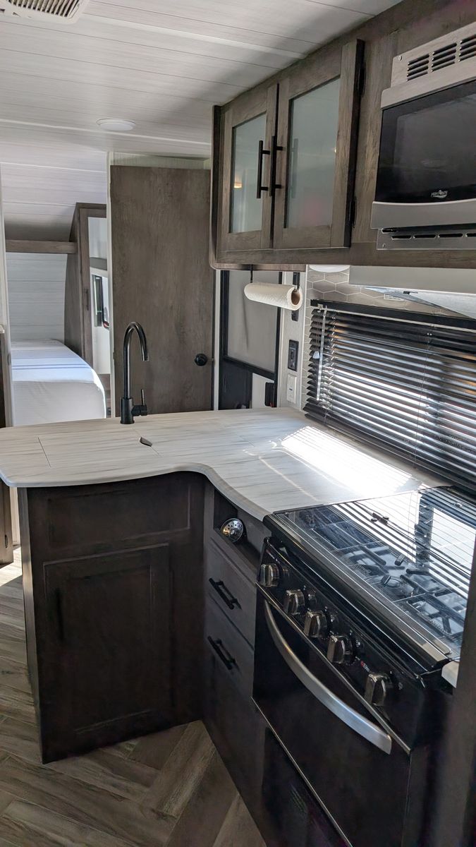 Features - Electric Kitchen slide out for more room, new tires for peace of mind on the road, 6 gallon water heater with DSI, Gas cooktop in the kitchen, Microwave with hood, Smart TV, a food pantry, and plenty of storage