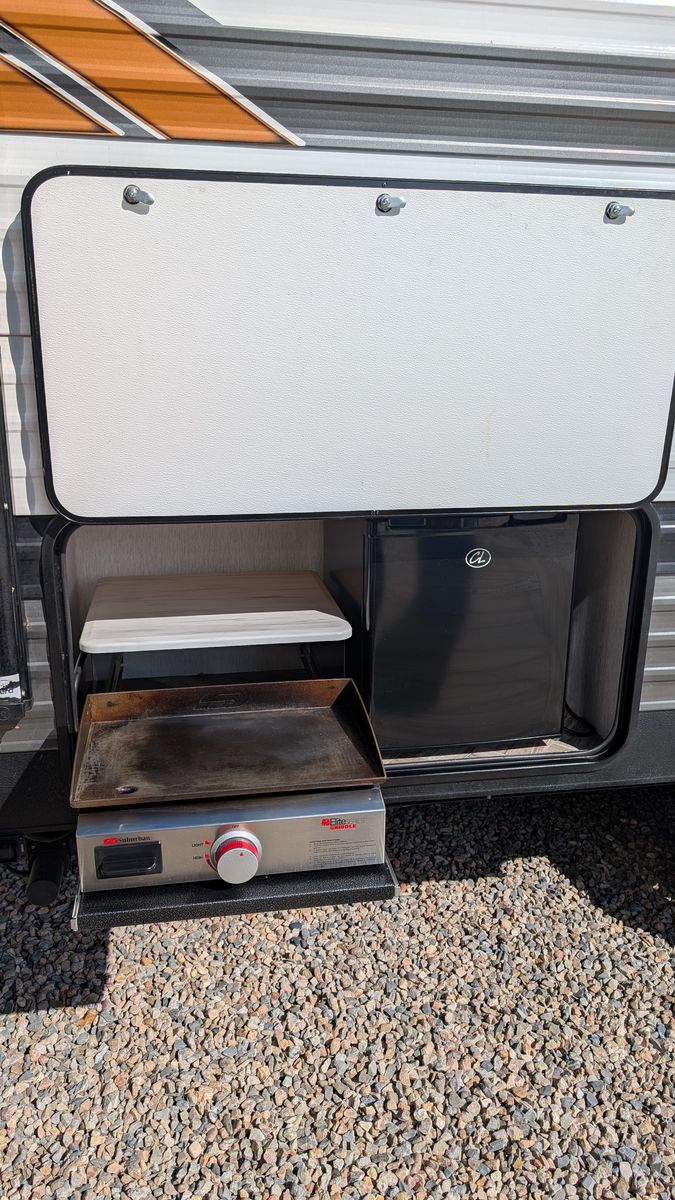 Outdoor Living - Comes equipped with an outside griddle and fridge, making camp cooking a breeze. Also includes an electric awning to give shade over the patio