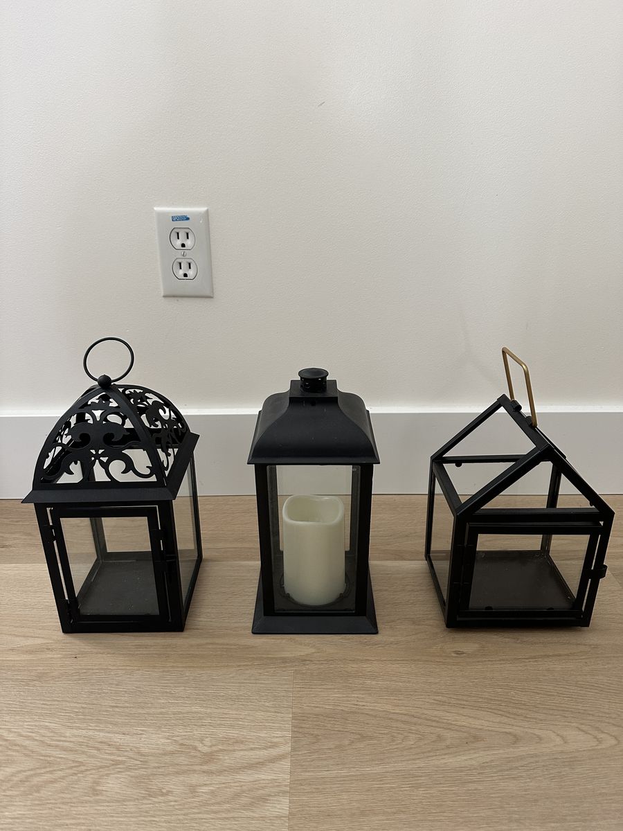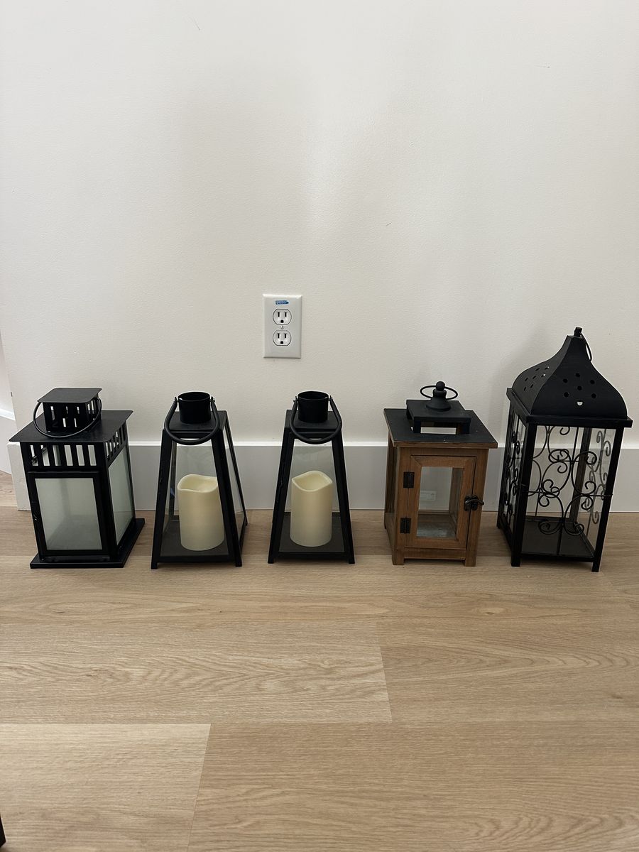 VenmoCute Balck Lanterns For wedding, Office, Home indoor or out door. Wood bottom Asking $14 Tallest one 19” Tall Asking $18 All other ones about 12 “ Tall Asking $12 each Total of 8 Serious inquiries only please!