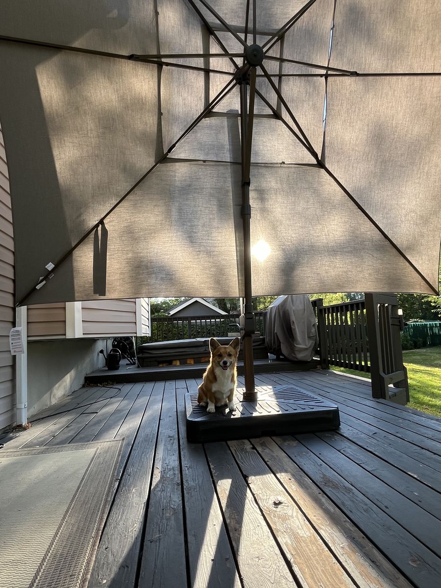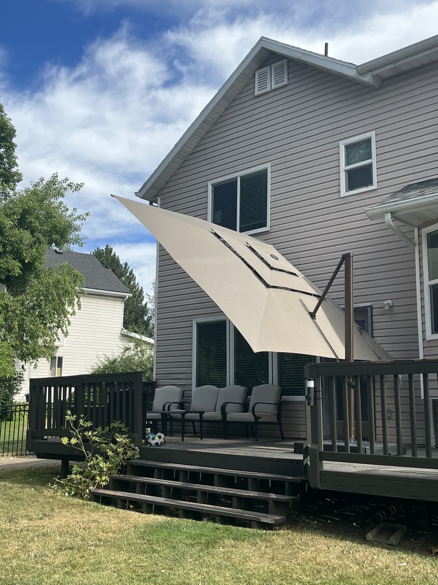 PayPalGreat condition 10-foot square cantilever umbrella (corgi for size). We used it one summer, 2024, but it was really too large for our deck, so it just sat in storage last year. Taupe color. Adjusts to be parralel with the ground or angles and rotates. Very easy to adjust, crank open, and close. Has a velcro wrap-strap to keep it closed. It does not have a cover. It's currently not set up and would require assembly. The base you can fill with sand or water to keep it in place. Orignally purchased for $625. Local sales only, no delivery, must be picked up because it won't fit in our cars. Call or text Melanie - 801-336-8154