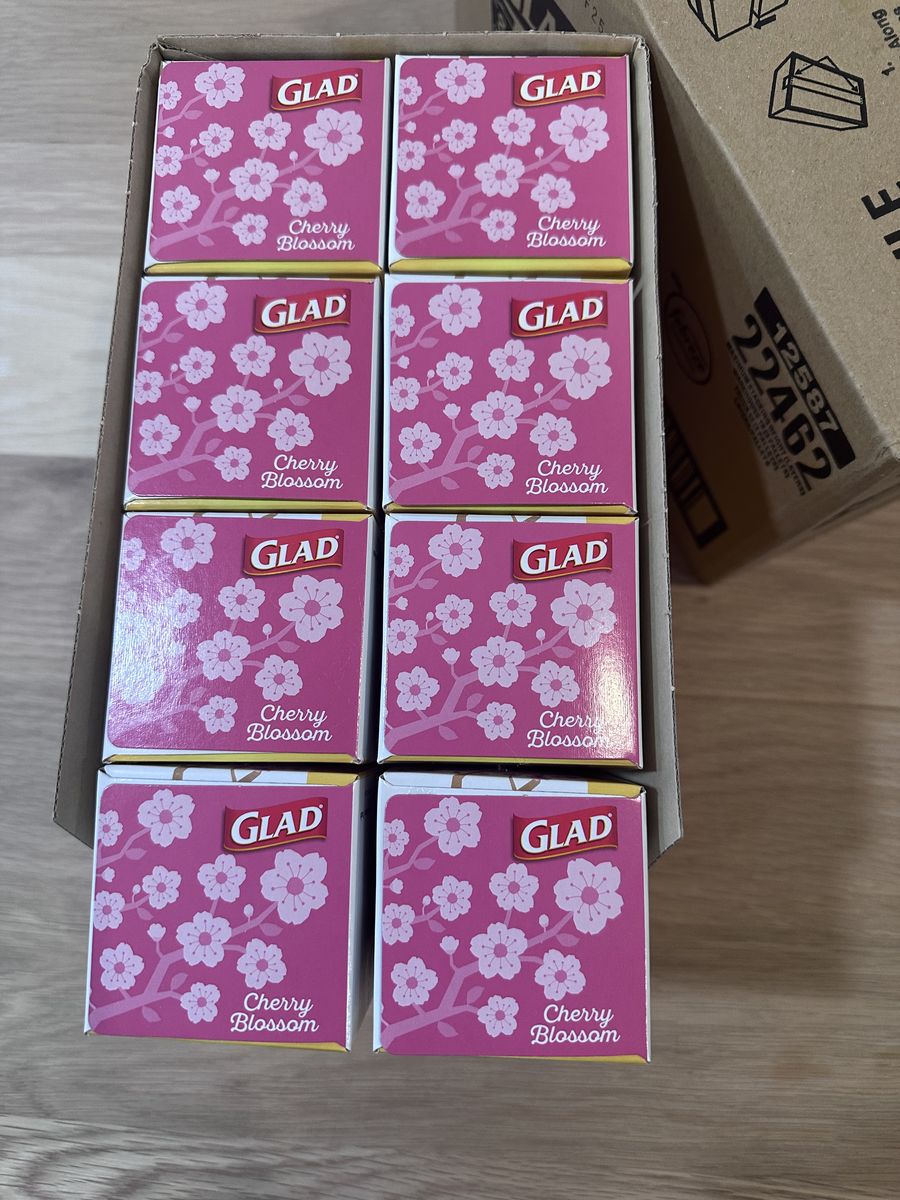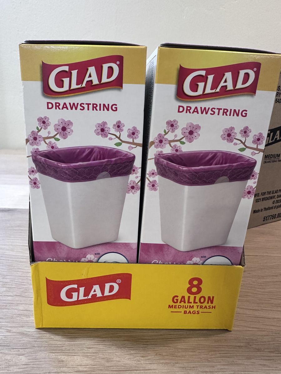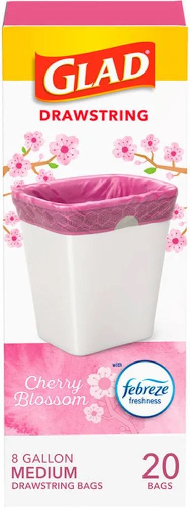 VenmoThe Glad OdorShield Medium Drawstring Trash Bags in Cherry Blossom scent are designed to provide a fresh and pleasant odor while tackling tough smells. With a capacity of 8 gallons and 120 count in the pack, these pink bags are convenient for home use. The drawstring feature helps to secure the bag and prevent spills, making cleanup easier and more efficient. Perfect for everyday household maintenance, these trash bags offer a reliable solution for keeping odors at bay. there are eight boxes of 20 in the case.