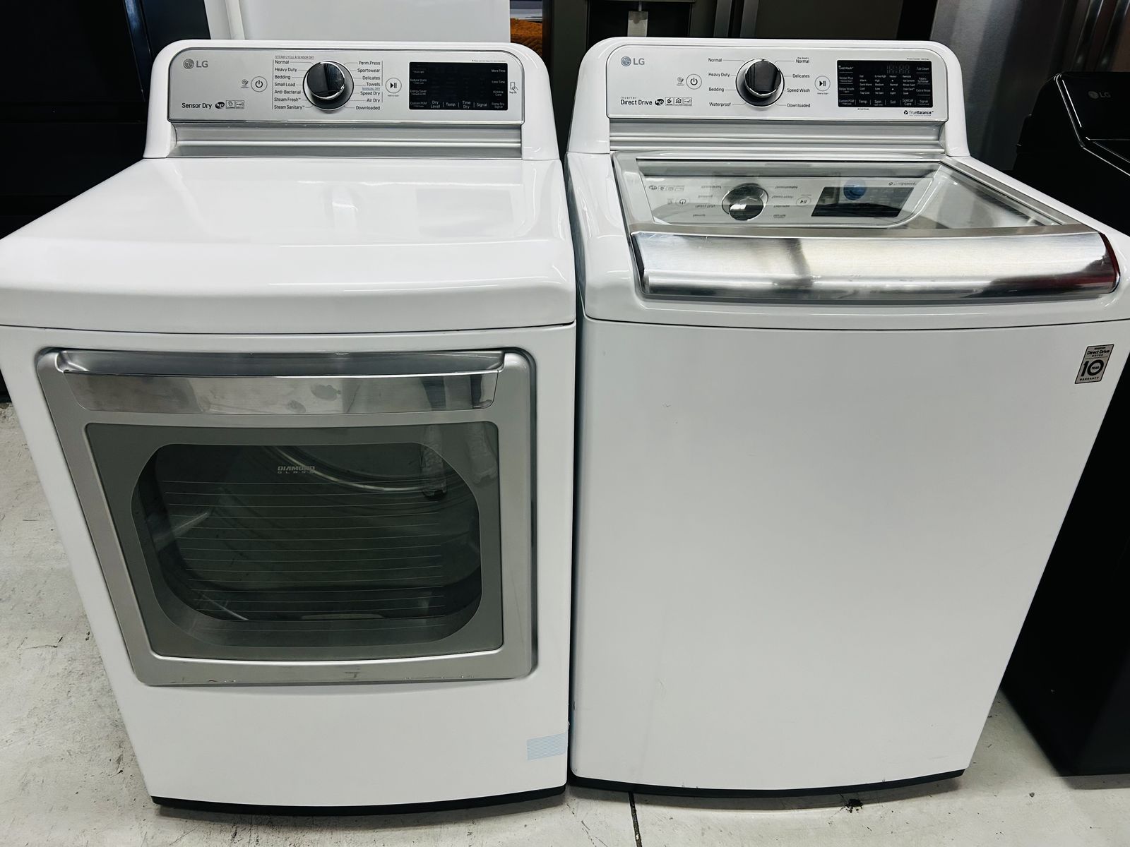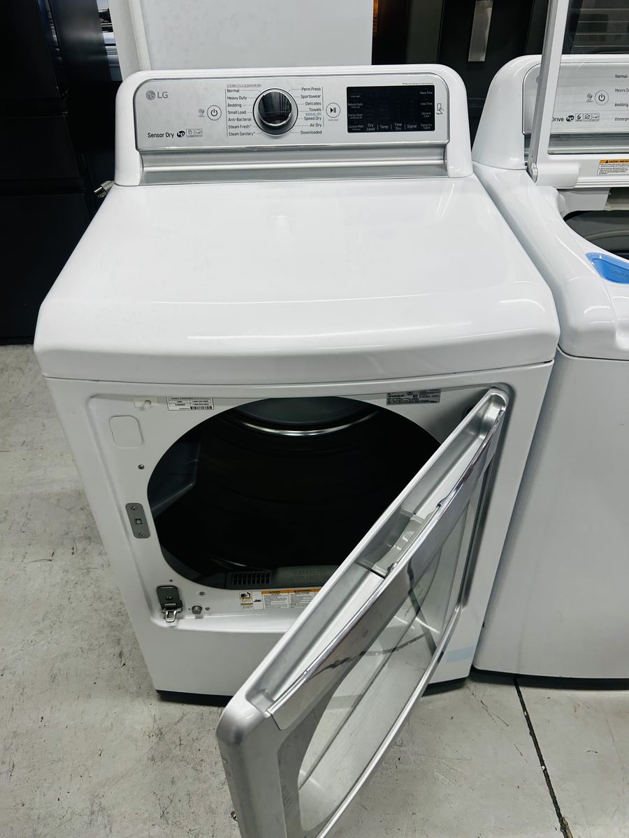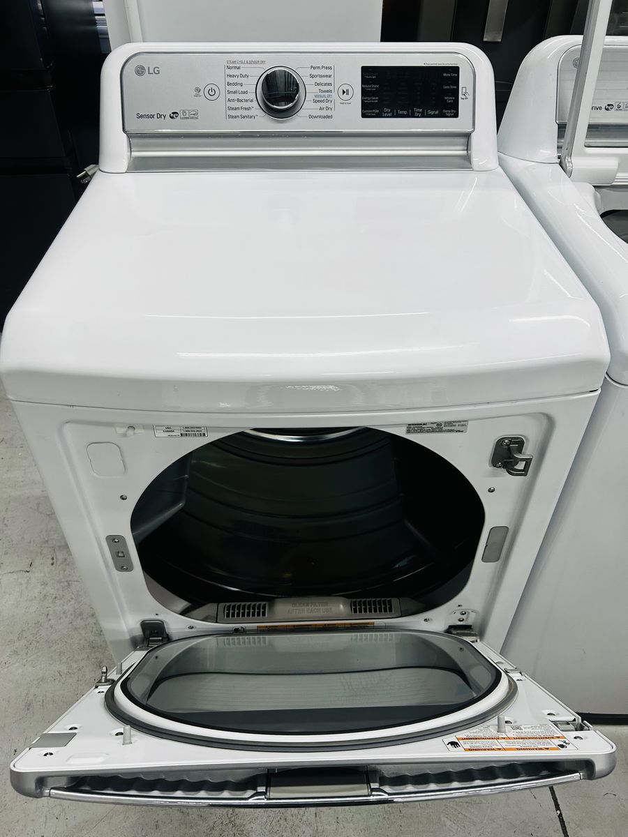 Lg washer inverter direct drive stainless steel drum heavy duty motion 6 energy star true balance anti vibration system tub clean bulky bedding cotton normal speed wash downloaded extra rinse water plus etc..Lg Steam Gas Dryer sensor dry stainless steel drum heavy duty cotton normal delicate casual anti bacterial air dry steam fresh steam sanitary time dry wrinkle care damp dry signal etc..They work great. Clean. 45 day warranty. Delivery/install available.