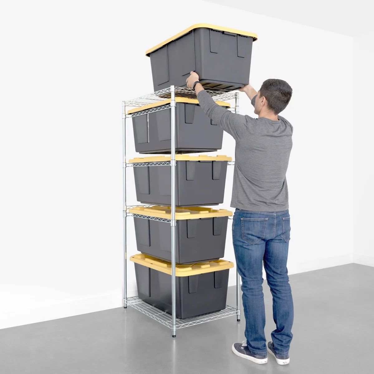 Elimate Down-Stacking Vertically stored bins allow you to maximize precious floor space. The SafeRacks Bin Rack offers convenient and easy access to your belongings by eliminating the hassle of down-stacking.