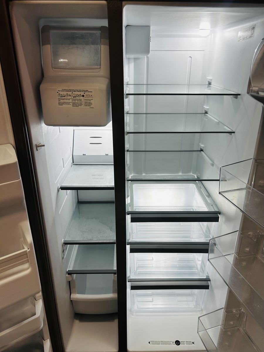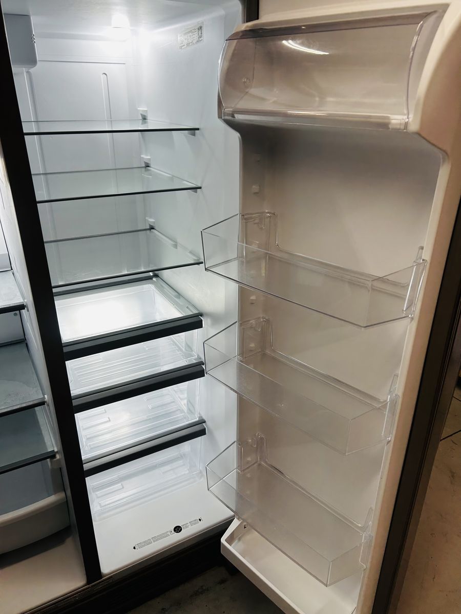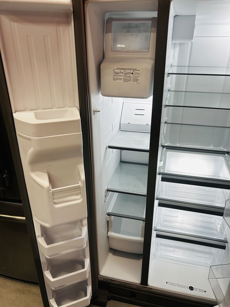 Whirlpool stainless steel side by side refrigerator with water and ice maker/dispenser snack drawer crispers butter bin gallon size door bins etc..Works great, clean, 45 day warranty, delivery/install available. W 33” D 30 3/4” H 65 1/2”
