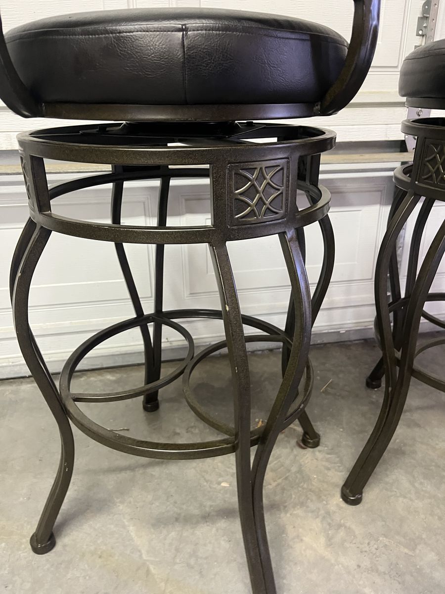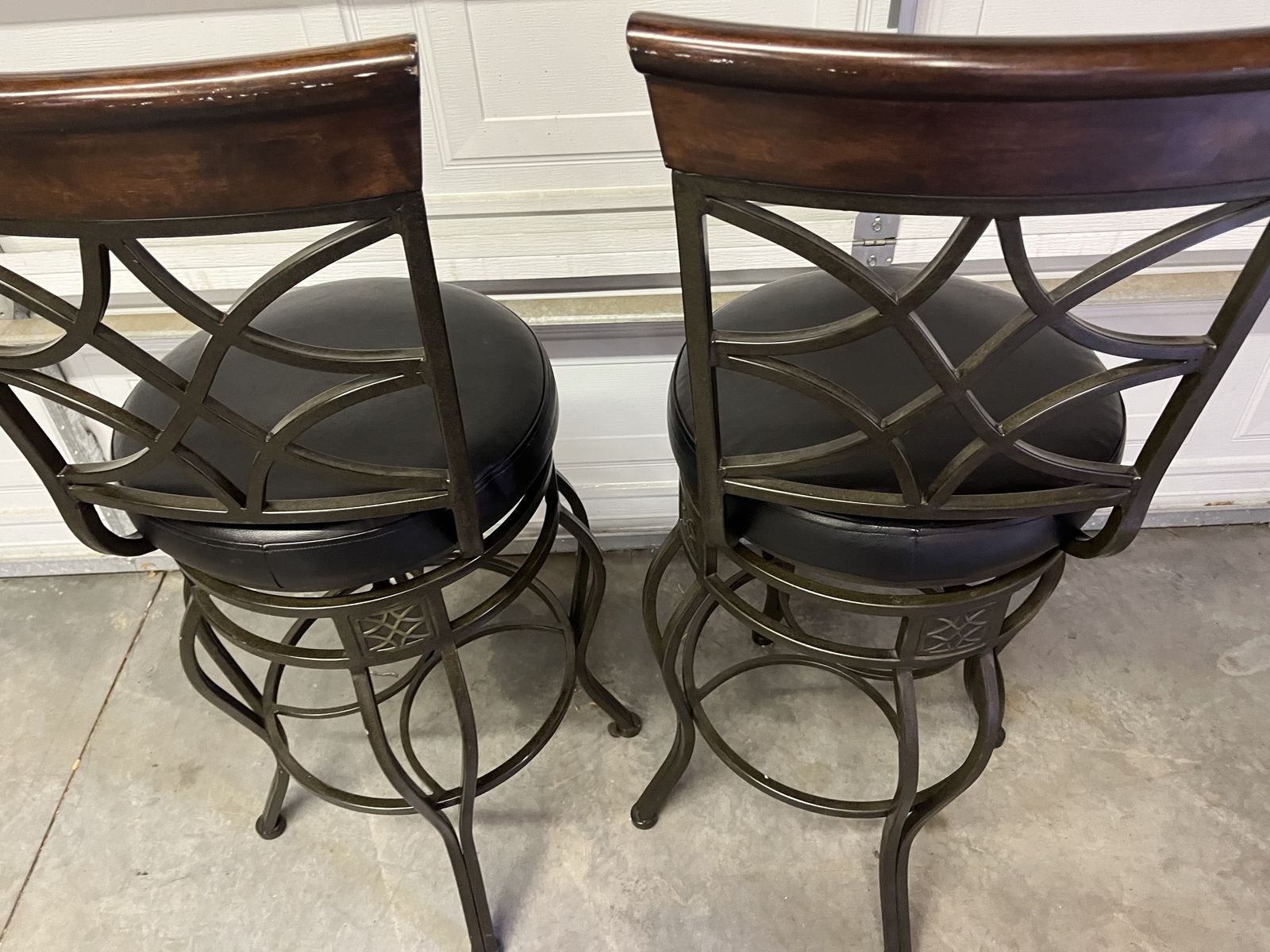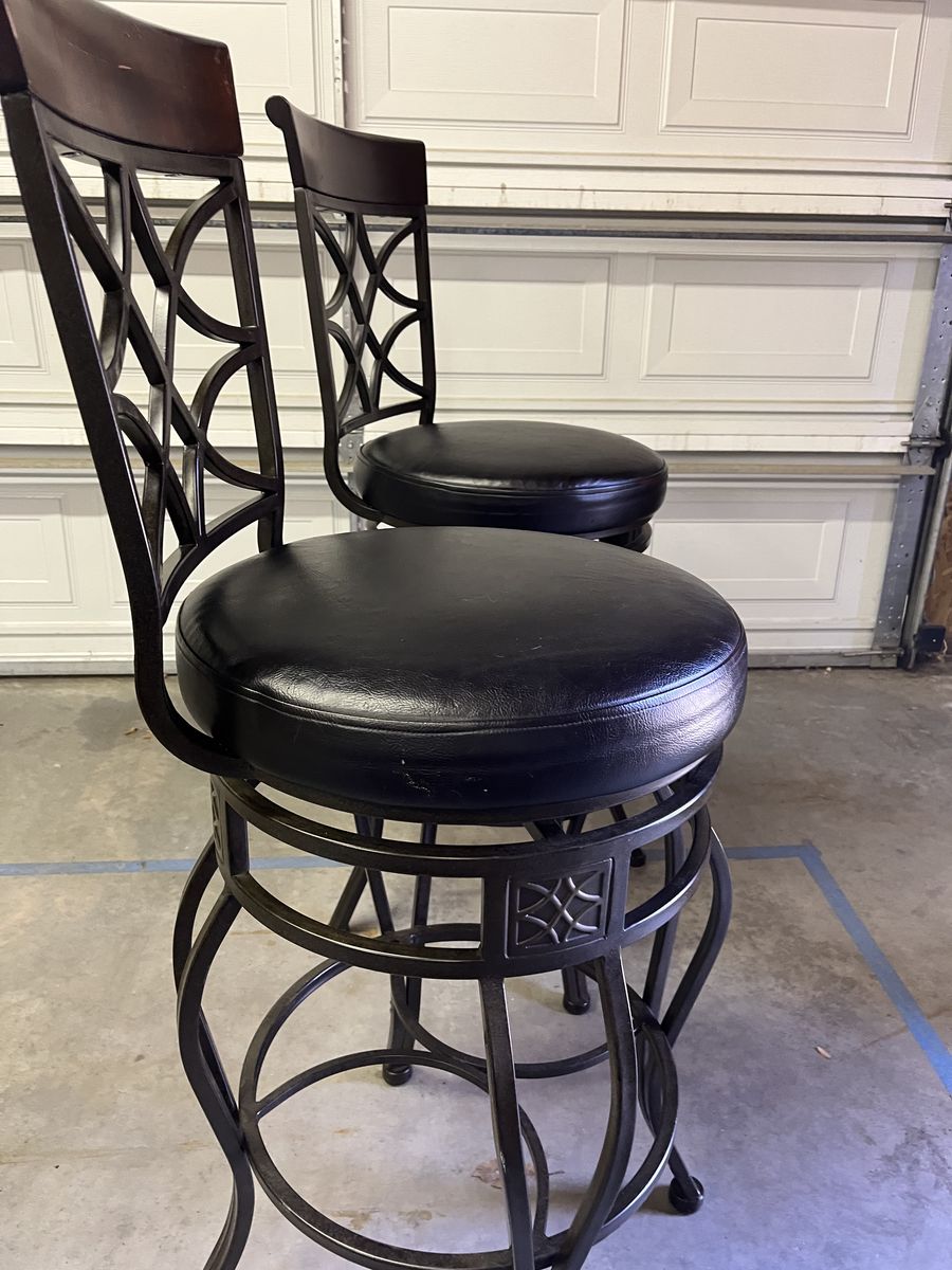 VenmoTwo sturdy/heavy counter height stools. Seat is around 30” tall from ground. Black leather or fake leather. Metal and brown wood seat backs. Price is total for both stools.