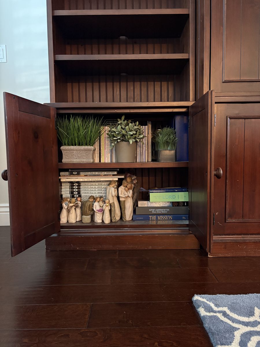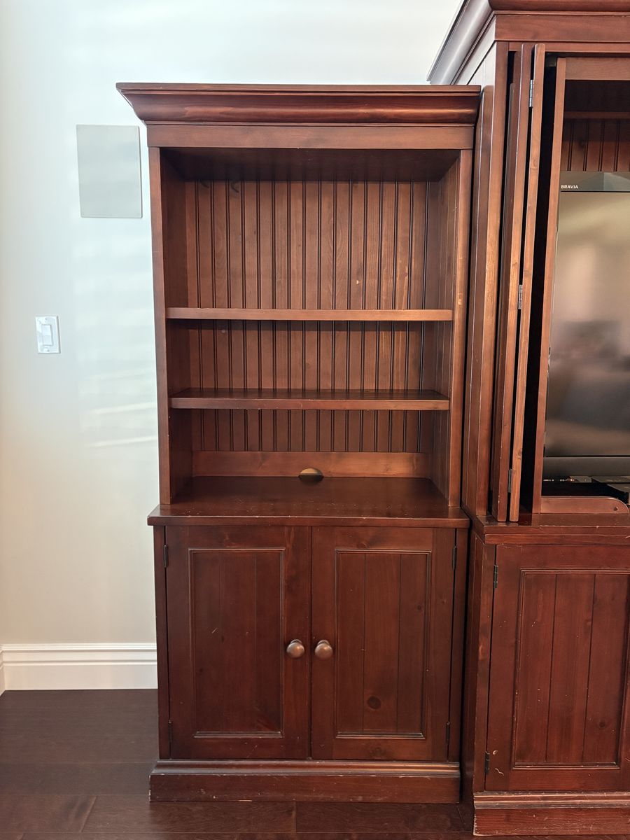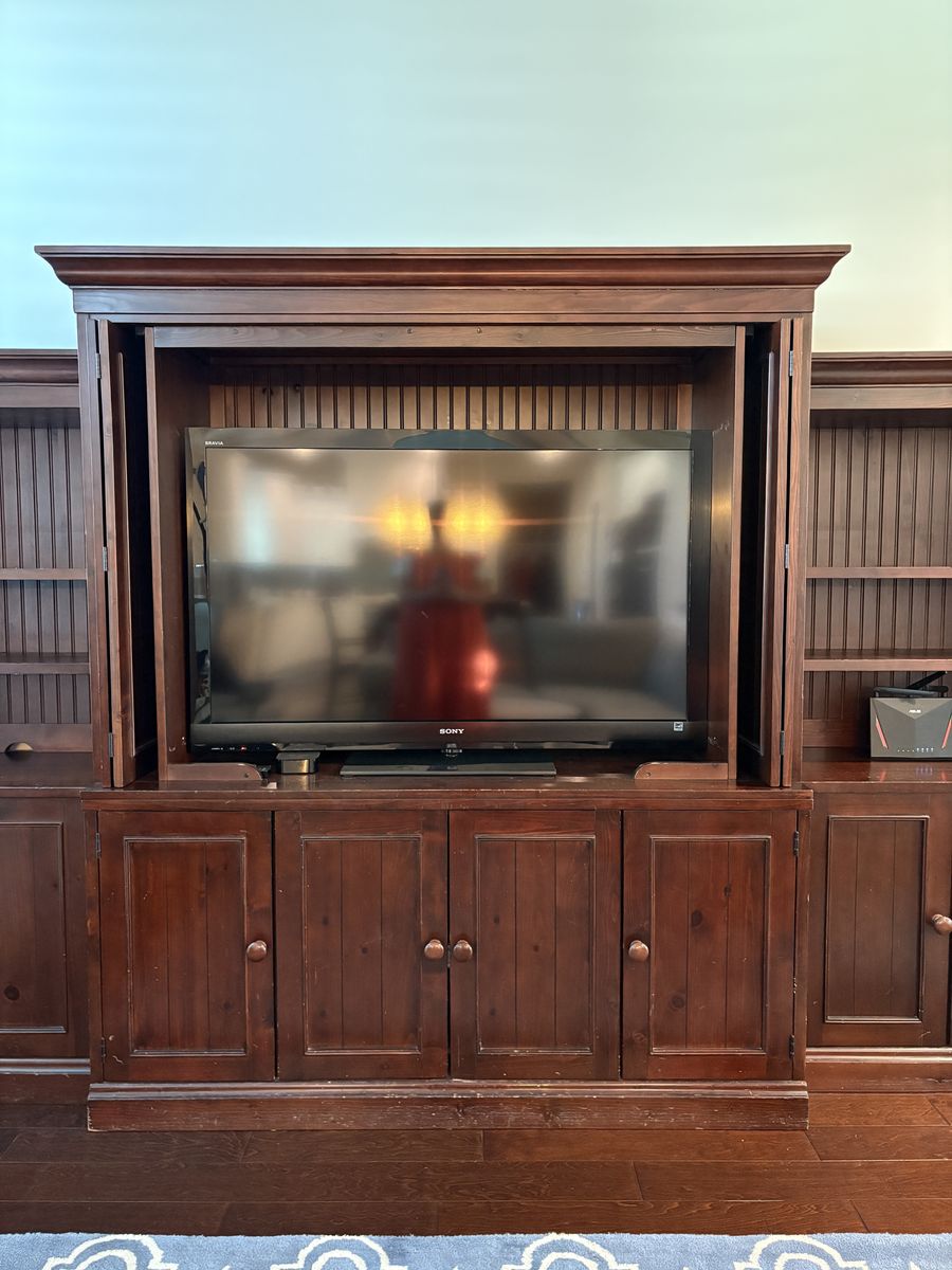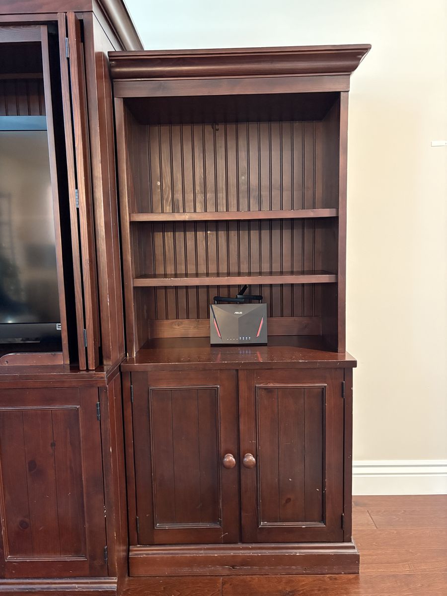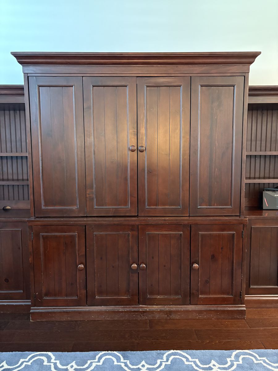 VenmoSpacious dark wood Pottery Barn entertainment center. Modular six-piece design for ease of transport. Central unit has spot forTV and lots of storage below. Side units have open shelving with beadboard backing and lower double-door cabinets. Great for media, books, and storage. Very heavy and well made. Nicks and scratches easily seen up close, not as noticeable from a distance.