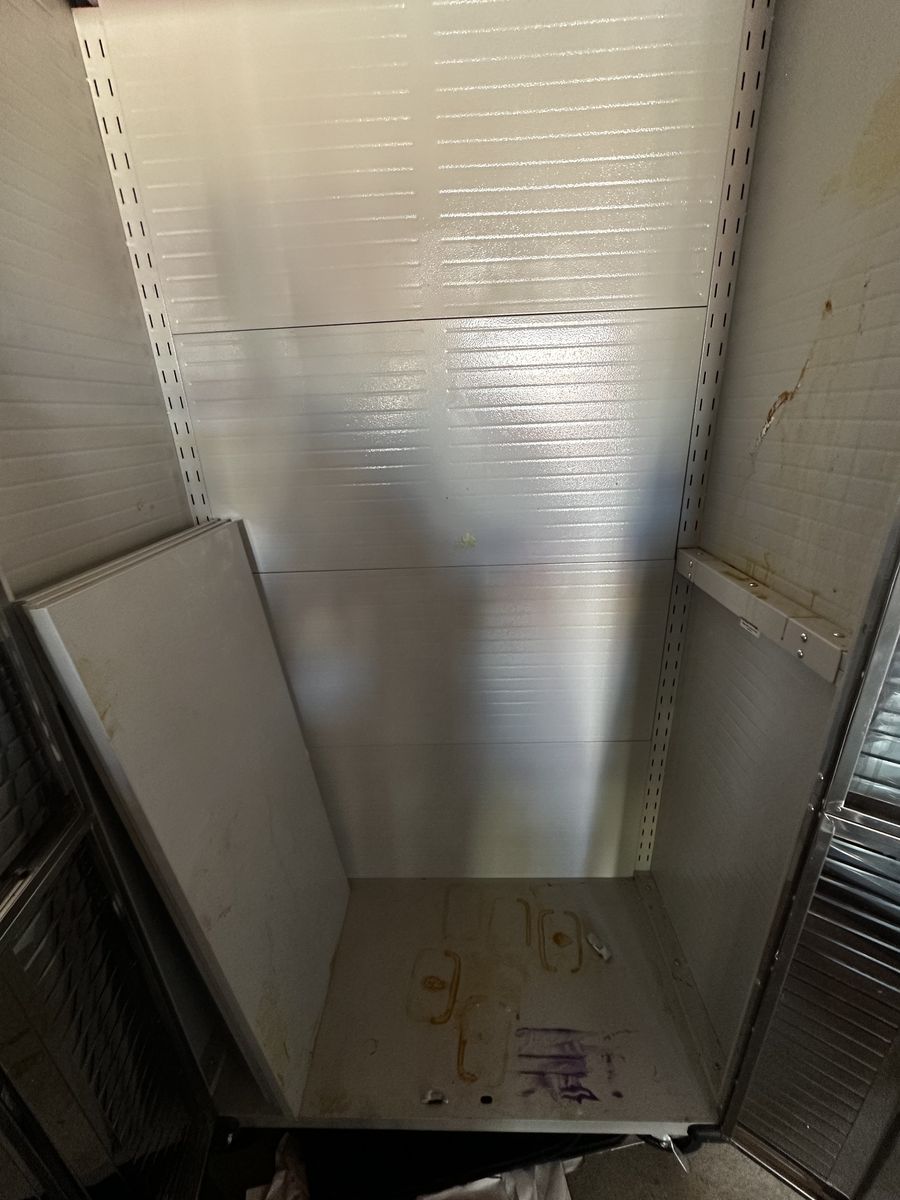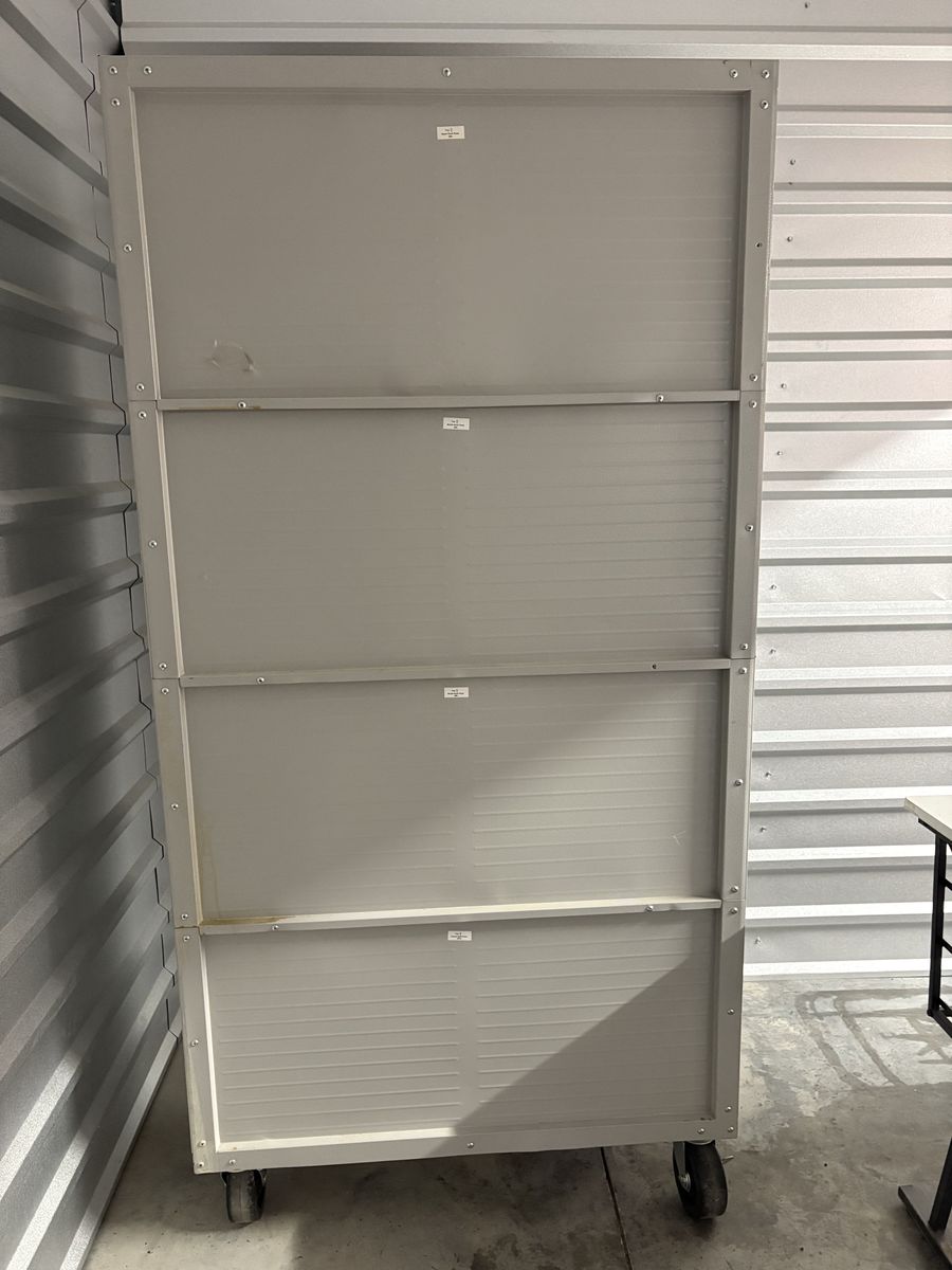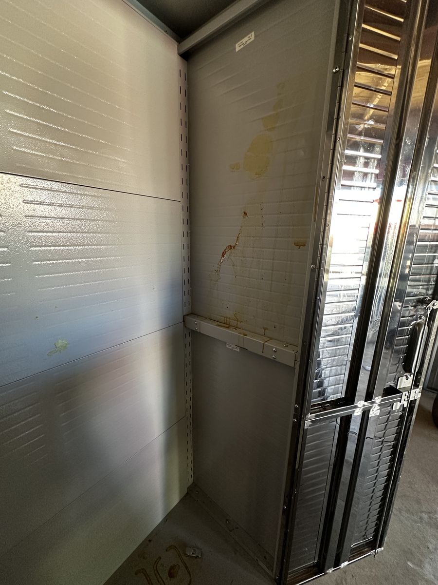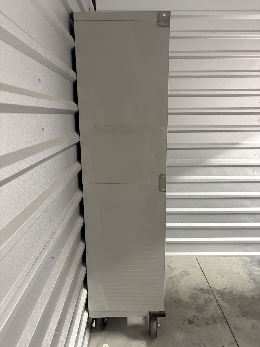 • Heavy-duty steel cabinet • Stainless steel doors • Adjustable shelves • Rolling wheels • New lock kit included