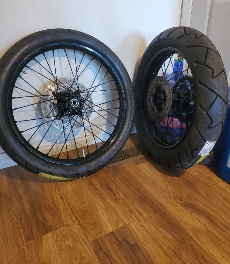 21/18 Harley wheel set. • DID Japan rims • Brand new Continental ContiTrailAttack tires (still have stickers) • Front & rear brake rotors • Rear sprocket installed • 3/4 axle setup • Purchased through Drag Specialties Great for: Harley-Davidson FXR Harley-Davidson Dyna Harley-Davidson Softail Ready to bolt on.